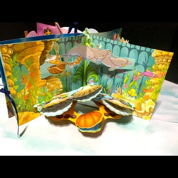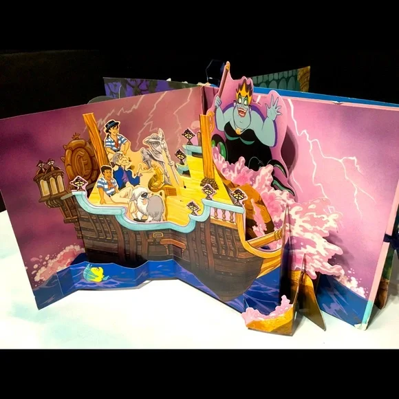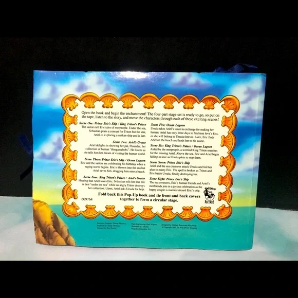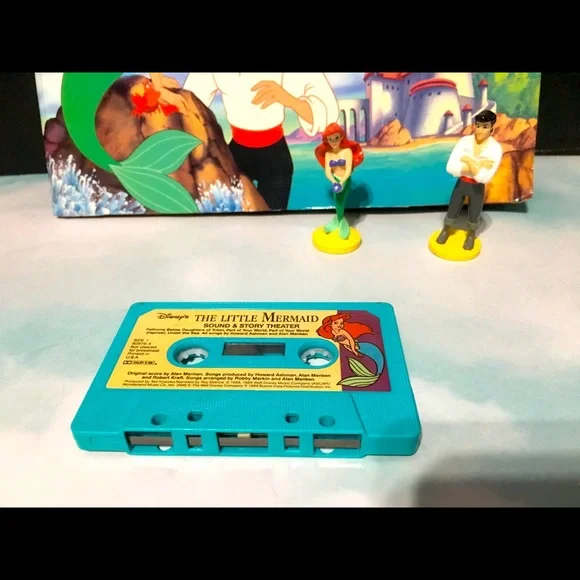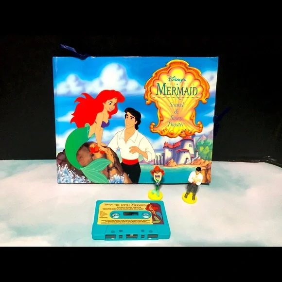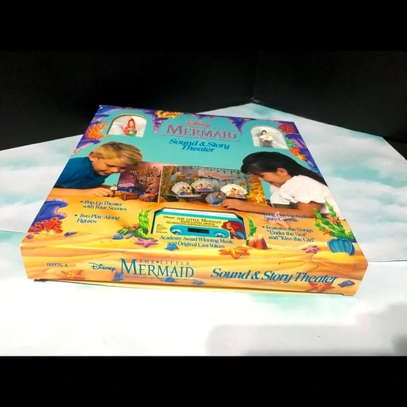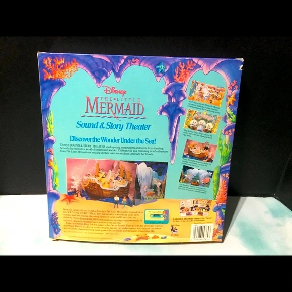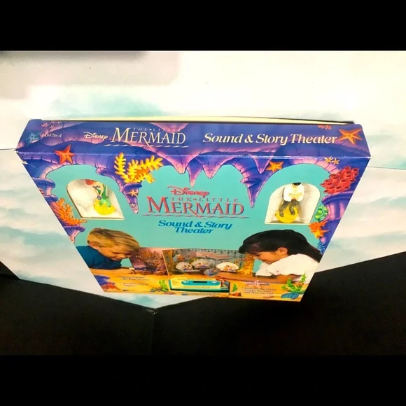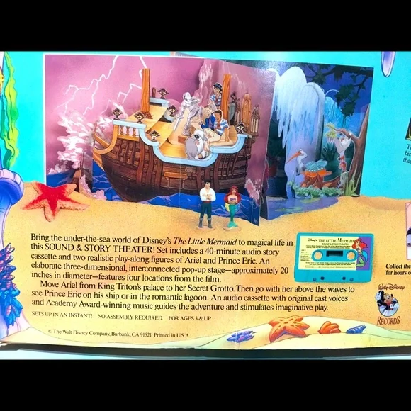Walt Disney’s 1990’s The Little Mermaid Sound & Story Theater In Original Box POP-Up Theater With 4 Scenes, Two Play -Along Figures Ariel & Eric, Long Playing Audio Story Cassette, Features The Songs “Under The Sea” And “Kiss The Girl” Academy Award Winning Music And Original Cast Voices Book And Box May Have tiny blemishes Box clear plastic torn covering figures Excellent Condition Shown In Pictures Box Size 12”x12”x1.5”