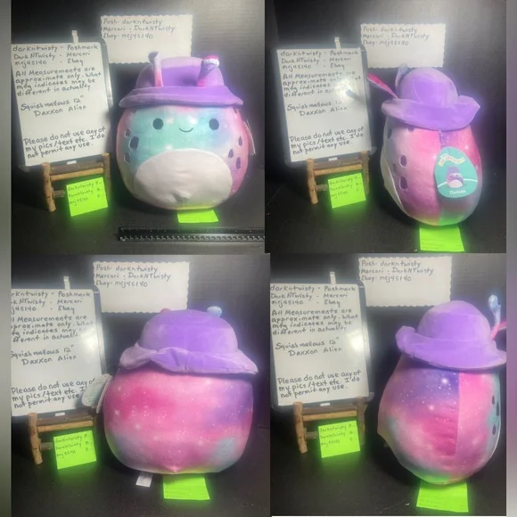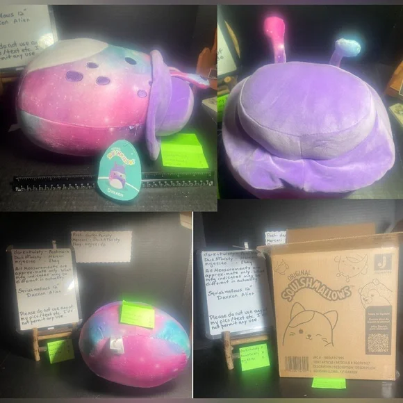 Please do not use any of my pics/text. No plagiarizing! Apologies Poshers, There has been Record High Listing thefts. To the poachers…please take your own pics and input your own data. It is disrespectful to author, dishonest to any would be buyer, and mail fraud is a federal offense. BNWT Original owner, removed item for pics. Never secondhandNever Displayed, Never Played with PFSF HomeNo formal visible flaws that I see. Please view pics closelyShipper has been opened to take pics. I will also have a listing with an unopened shipper. Item may or may not be mailed in actual shipper or mailed in the shipper plus an outer box. Shipper is included. All measurements are approximate only*A portion of proceeds are donated directly to our local food bank.* *Additionally we just donated 100+ brand new stuffed animals and toys $1600 to Toys for Tots for Holiday DistributionNo comments regarding pricing please. This is against platform etiquette. All lowballers blocked; neither cost nor time effective.All items are videoed before, during, and post packaging processTags: squishmallows, character pillows, aliens, Daxxon, tie dye plush,