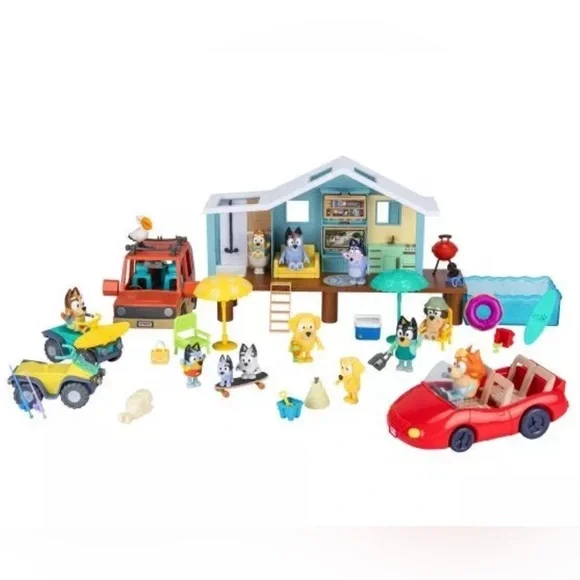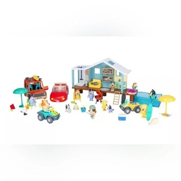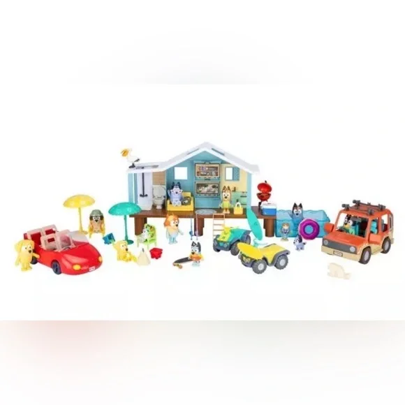 Features:Total 45 Play PiecesIncludes:(1) Beach Cabin;(4) Vehicles;(12) Figures;(1) Sticker Sheet;(27) Accessories;Recommended Age: 3+ Go on the ultimate beach vacation with the Bluey Friends and Family Beach Set. This mega pack includes Bluey´s Beach Cabin playset, 4 vehicles, 12 figures and tons of accessories to create a memorable day at the beach. The cabin is over 10-inch (25cm) wide and comes with everything Bluey and her family need to relax and play. Plus, this playset expands out to include its own beach to swim in. Place the figures into the vehicles that come with the set and explore the beach. Ride on the Beach Quads, Land Cruiser and Convertible. With 45 different play pieces including a surfboard, skateboard, BBQ, and much more.WARNING! CHOKING HAZARD. Small parts. Not for children under 3 years.