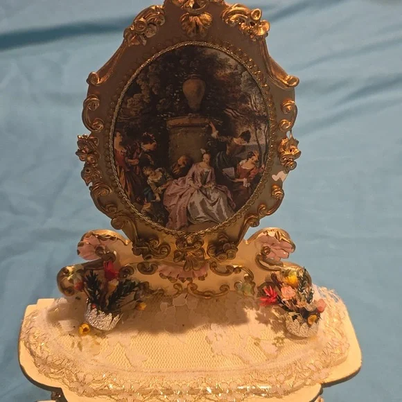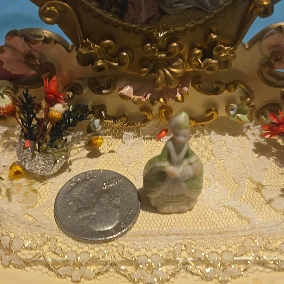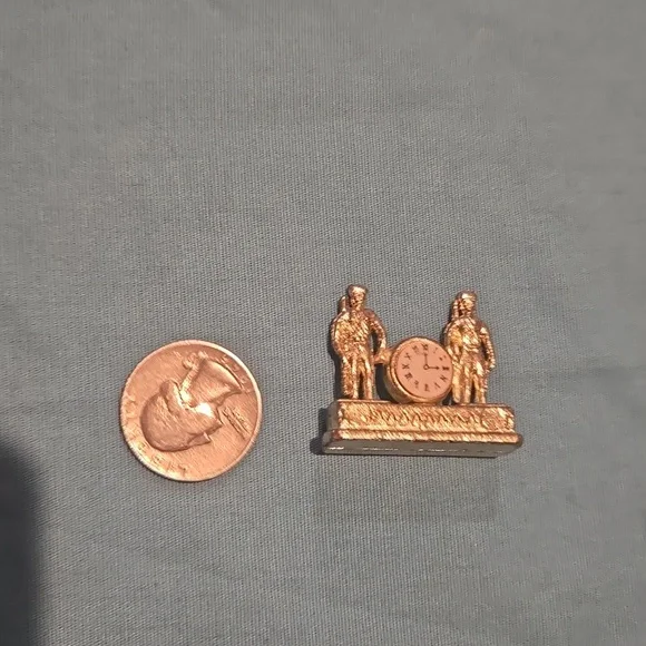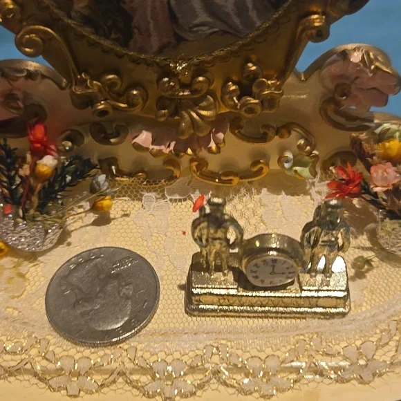 VINTAGE dollhouse fireplace set. quarter for scale. clean and kept in smoke free home.SET INCLUDESornate Rococo fireplace with attached painting one elaborate candleabraone pewter mantle clock with two solidersone porcelain Rococo woman statuette