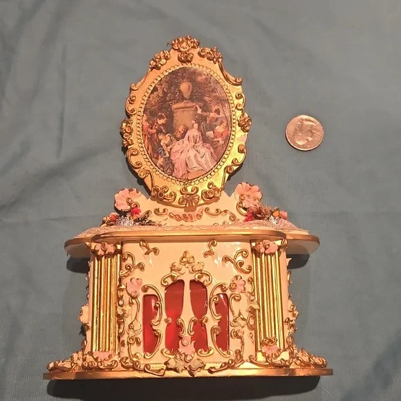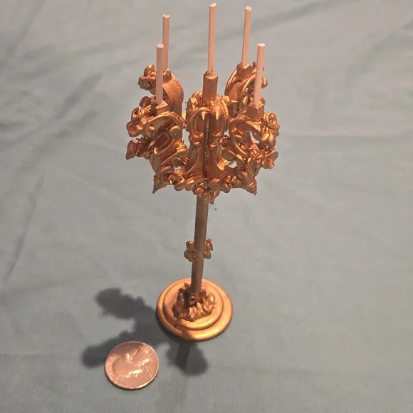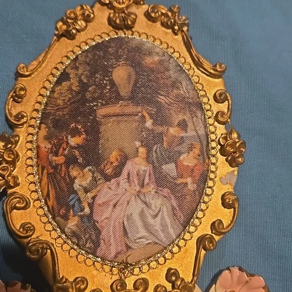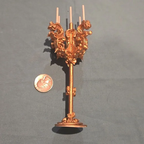 VINTAGE dollhouse fireplace set. quarter for scale. clean and kept in smoke free home.SET INCLUDESornate Rococo fireplace with attached painting one elaborate candleabraone pewter...