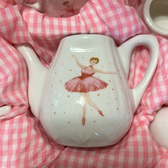 NWT Delton Ballerina PorcelainTea Party SetFeatures & detailsQuality porcelain ceramic tea set in fabric lined basketSet includes storage wicker basket with leather strap and clasp Tea service for two:Knives, spoons and forksTea pot with lid dessert platesTea cups with saucers Sugar with separate lidCreamer Quality porcelain ceramic tea set in fabric lined basket. Beautiful and fun, whether you are hosting a tea party or just playing kitchen. Ballerina design on all pieces but lids with pink gingham fabric lining. Basket measures 10 x 7 x 5 inches.Ages 5+ recommended
