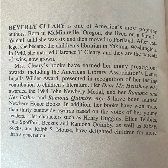 vintage accelerated reader AR paperback books by Beverly Cleary for elementary school childrenMost our preowned and vintage ranging from the 1970s-1990sThey feature popular characters like Ramona Quimby, Henry Huggins, and Ralph S. Mouse. These books were part of school reading Accelerated Reader programThe books include:Henry and RibsyMuggie MaggieRamona ForeverRunaway RalphRamona Quimby, Age 8Ramona and Her MotherRamona and Her FatherEmily´s Runaway ImaginationBeezus and RamonaBeverly Cleary was a celebrated author of children´s and young adult fictionHer stories portray the everyday lives and challenges of children, making them relatable and engagingCleary won numerous awards for her work, Ramona Quimby, Age 8 and Ramona and Her Father were named Newbery Honor BooksThese books are not just entertaining but also have educational value, encouraging reading comprehension and critical thinking in young readersThey are a testament to Cleary´s contribution to children´s literatureExplore the adventures of ´s beloved characters with this vibrant book collectionPerfect for elementary school aged readers, these books feature engaging stories We have many more accelerated reader book series in our closet and will bundle for a great deal of 20% off 2 or more listingsSmoke free businessGet this bundle of nine vintage Beverly Cleary, AR accelerated reader paperback books