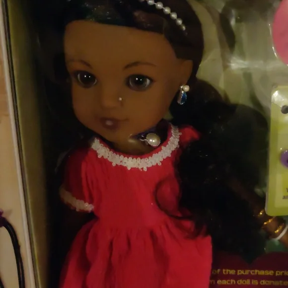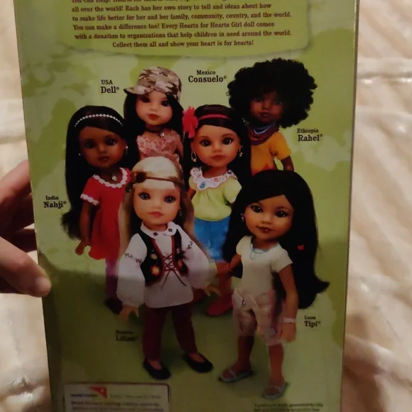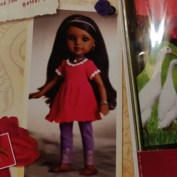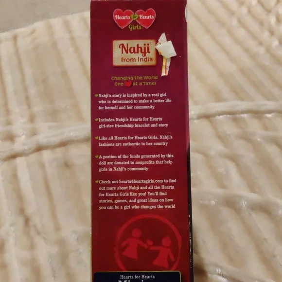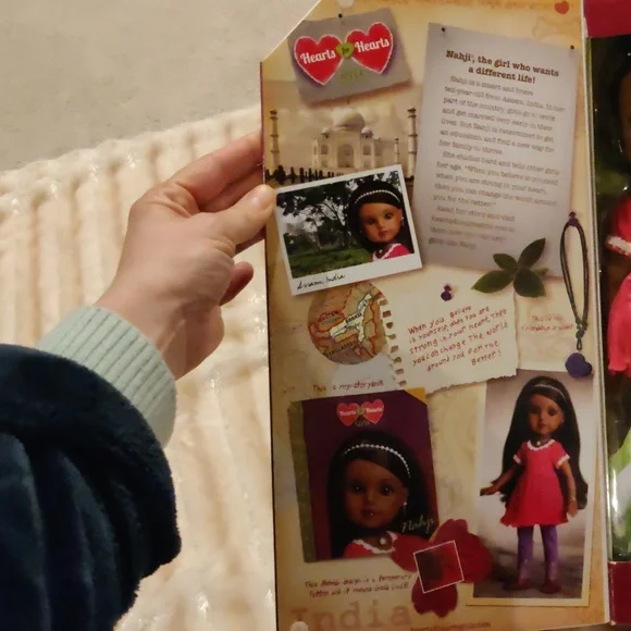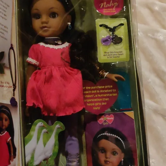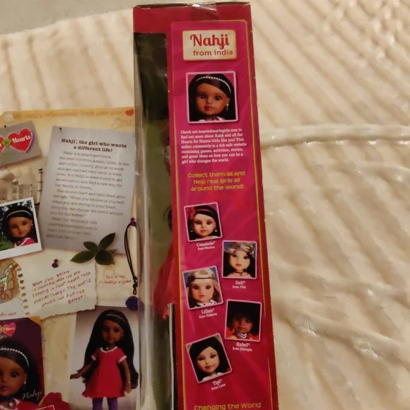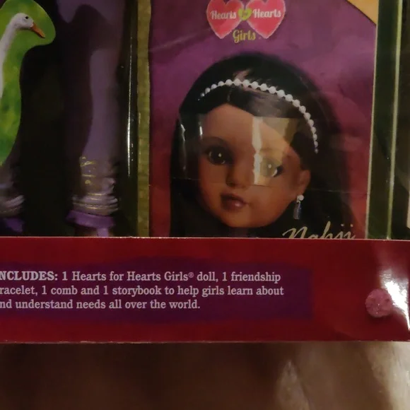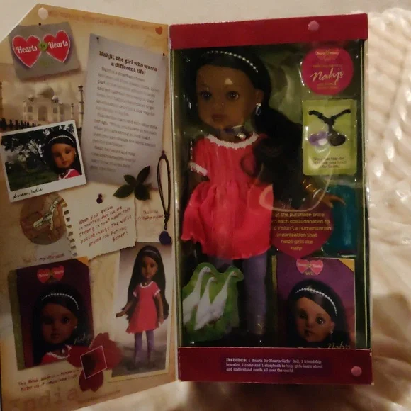NewHearts for Hearts Girls Nahji from India 14" dollThis beautiful Hearts for Hearts Girls Doll named Nahji from India is a must-have for any doll collection. With stunning brown eyes and brown hair, this 14-inch girl doll is dressed in a gorgeous pink dress and purple leggings with jewelry accessories to match.The set includes not only the doll but also a friendship bracelet, comb, and storybook. Manufactured in 2017 by Playmates Toys this doll is recommended for children aged 6 and above. Beautiful and new. She’s never been taken out of the box. Box may have some shelf wear.