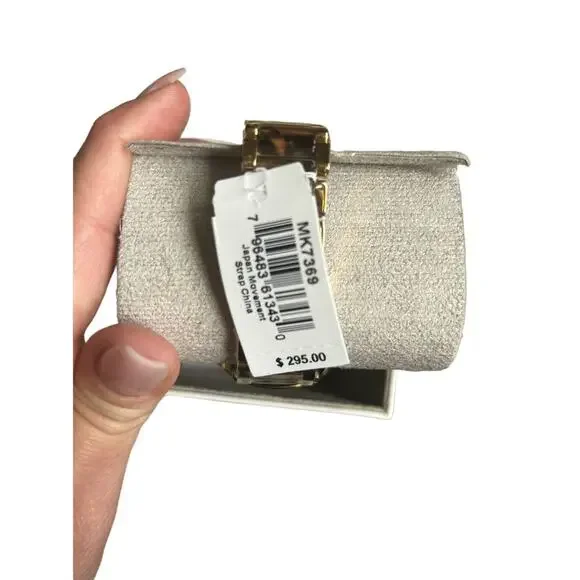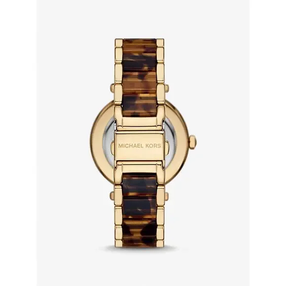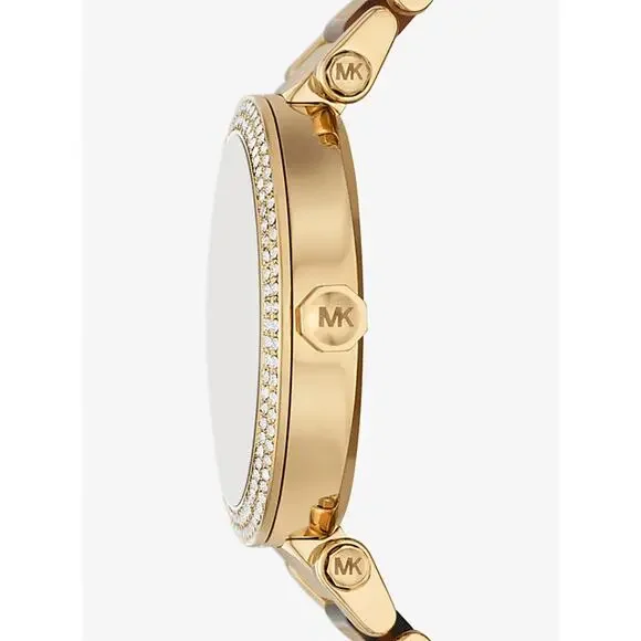 MICHAEL KORS Parker Pavé Gold-Tone and Tortoiseshell Acetate Watch. NEW IN BOX (Box has a smudge on the corner) MSRP $295. New with tags.Design:Turn your attention to the Parker: this sleek-and-chic timepiece is trimmed with sparkling pavé stones for an elegant, uptown sensibility. We updated this favorite by adding our Signature logo onto the gold-tone dial and finishing it with a tortoiseshell acetate strap. With just the right amount of sparkle, it’s the perfect watch to glam up an everyday look.Details:• Watch• Stainless steel/acetate• Gold-tone hardware• Mid-sized• 39mm case• Quartz/3-hand movement• Clasp fastening• Water resistant up to 5 ATM• 2-year warranty• Imported• Style # MK7369