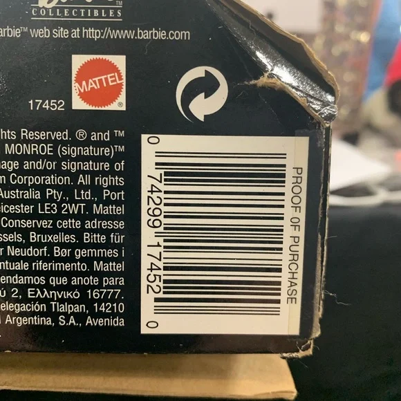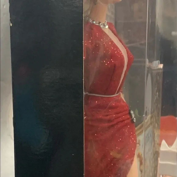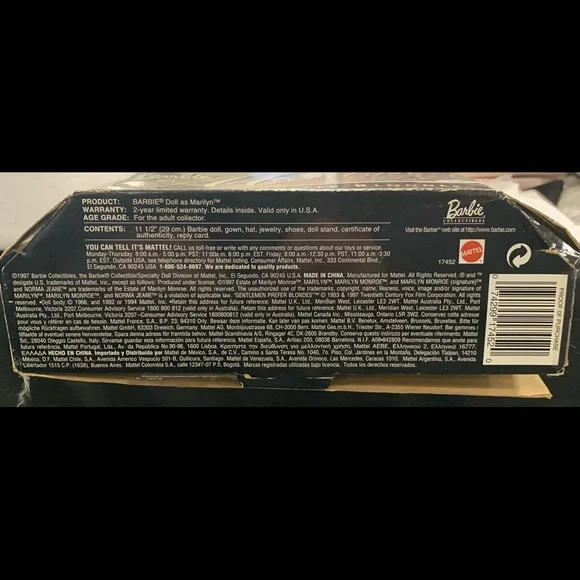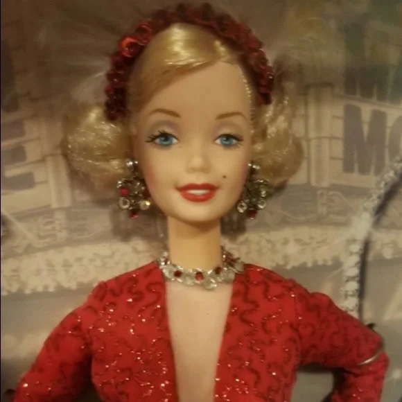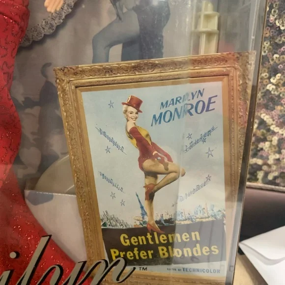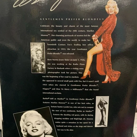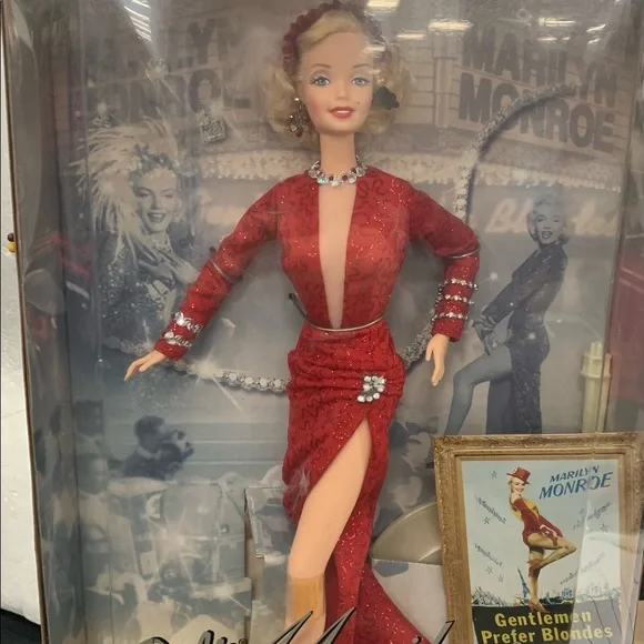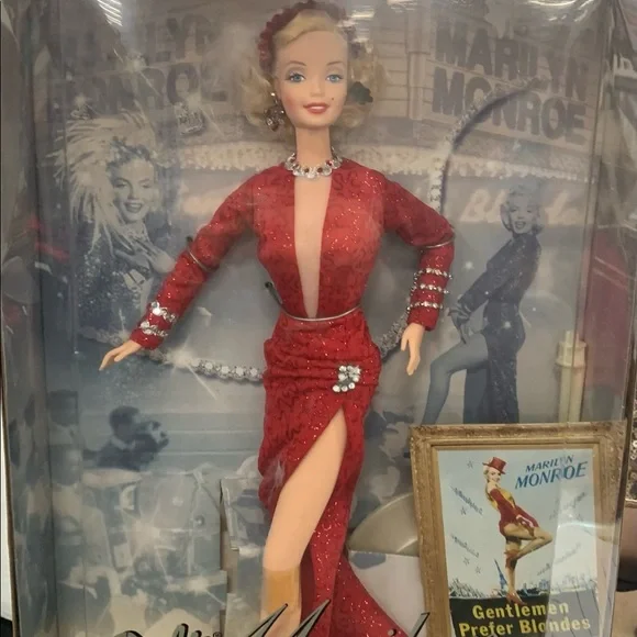 Barbie as Marilyn in "Gentlemen Prefer Blondes" Movie Collector Edition Doll 1997Daring style and excitement from Barbie doll as she recreates Marilyn Monroe´s role of Lorelei Lee in the popular musical Gentlemen Prefer Blondes.Barbie is dazzling in her glittery red gown with its daring V-neck and high slit.Sparkling accessories include rhinestone bracelets, necklace and earrings with a glittery red hat topped with feather plumes.Marilyn and Barbie collectors alike will treasure this beautiful recreation with its authentic look and feel.Release Date: 1/1/1997Some Shelf Ware on Box. See photos.Never removed from box.