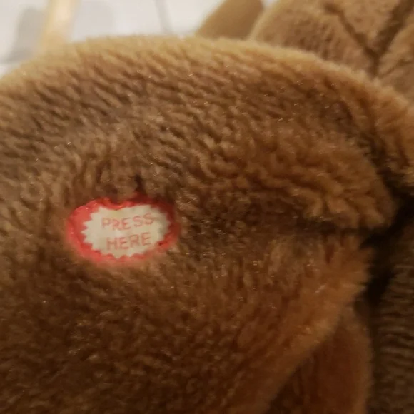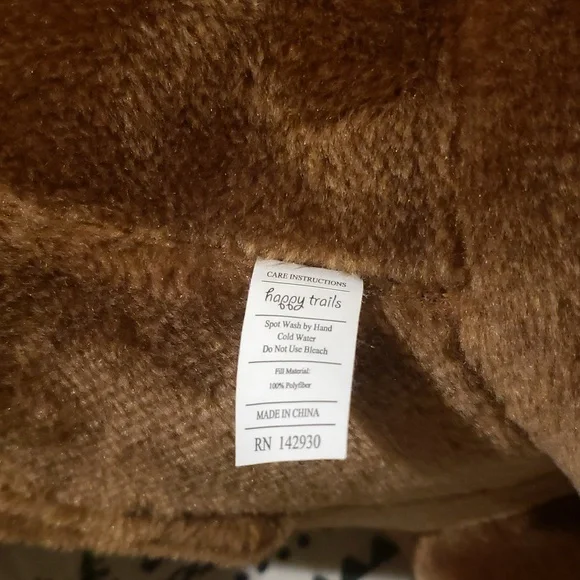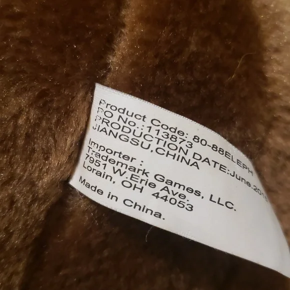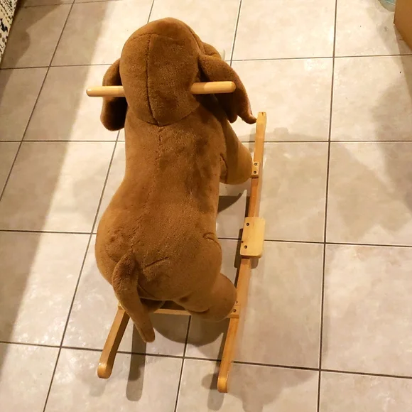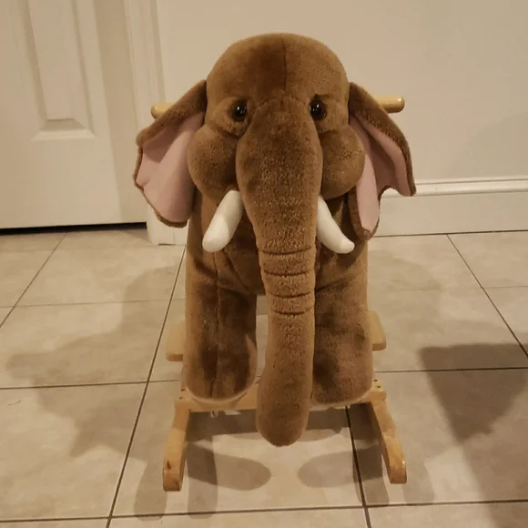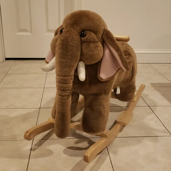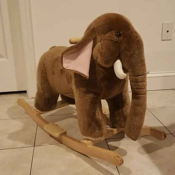This delightful stuffed elephant rocker boasts a soft brown plush body with charming pale pink inner ears accents. Its sturdy wooden base ensures a smooth rocking motion, while the large floppy earsand curved trunk enhance its adorable design. Stands on sturdy wood rockers. Makes elephant sounds if a button on the left ear is pressed. Perfect for imaginative play, this toy is a wonderful addition to any playroom.Recommended Weight Limit: 80lbs. Seat Ht. 15".Ages: 2 yrs. and up.Please watch the video to hear the sound.Approx. 29" x 21" × 11"EUC