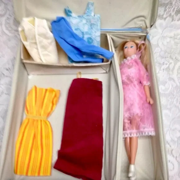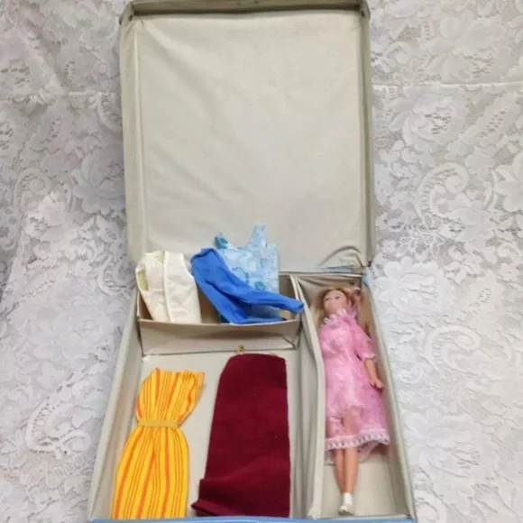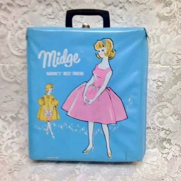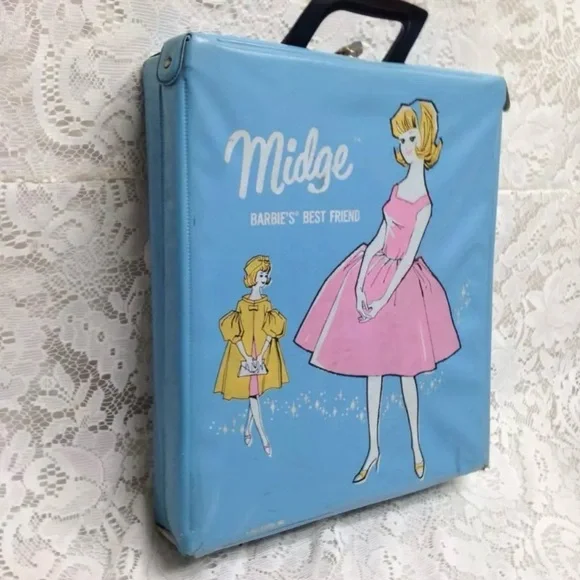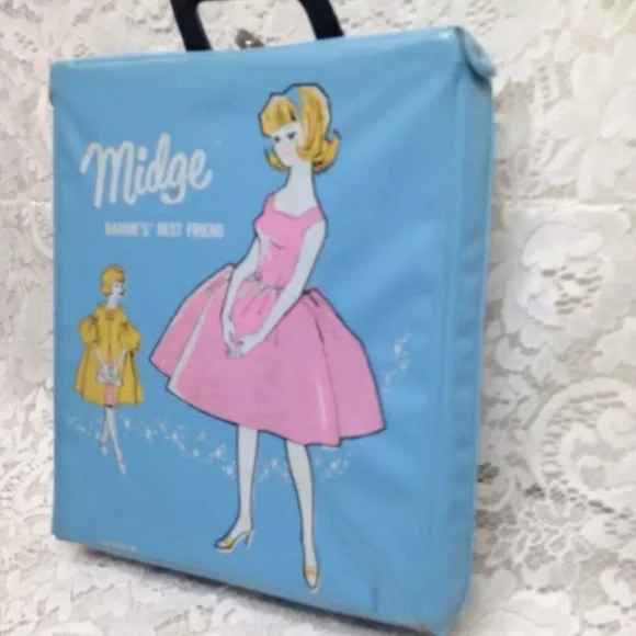 1963 Vintage Blue Vinyl Midge - Barbies Best Friend Carrying Case with 11in Doll with Wardrobe (J0225)This is a beautiful carrying case with a rare but imitation Midge doll, Hong Kong made and 5 extra clothing.The box measures about 12 inches long, 11 inches wide and 3 inches high. It is in good condition as shown in photos. The carrying case is marked: 1963 Mattel Inc;, The doll is 11 inches tall and marked Made in Hong Kong.