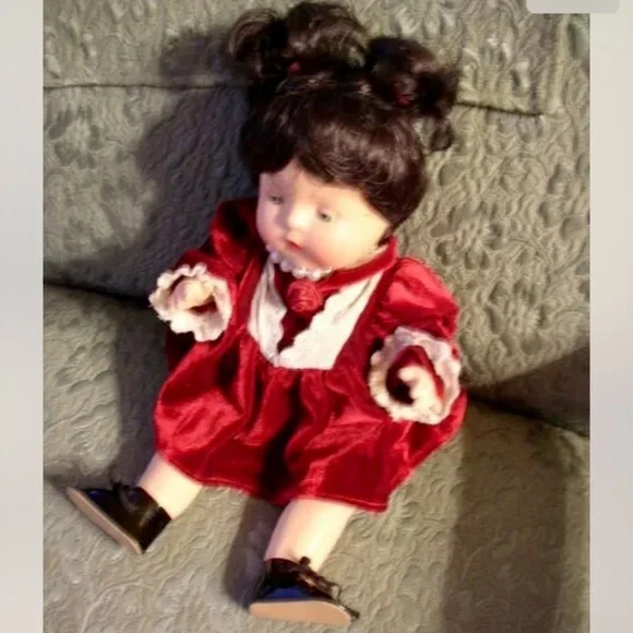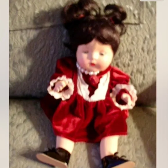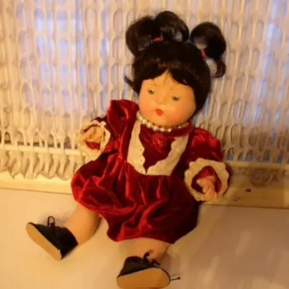 Vintage, 12” Composition Baby Doll in Burgundy Velvet Dress(T1122)This is a beautiful doll made of composition head, arms, legs and body. She has black hair or pair of black...