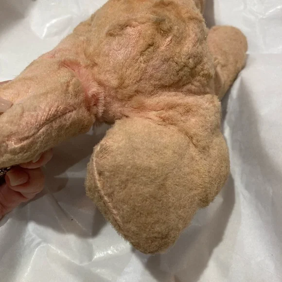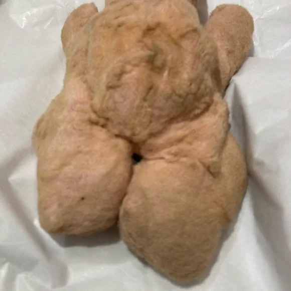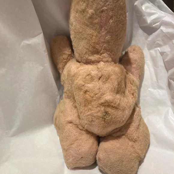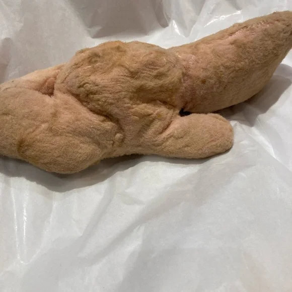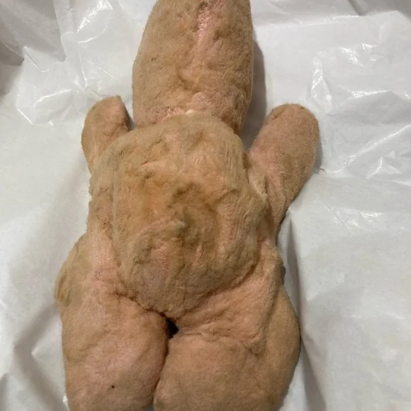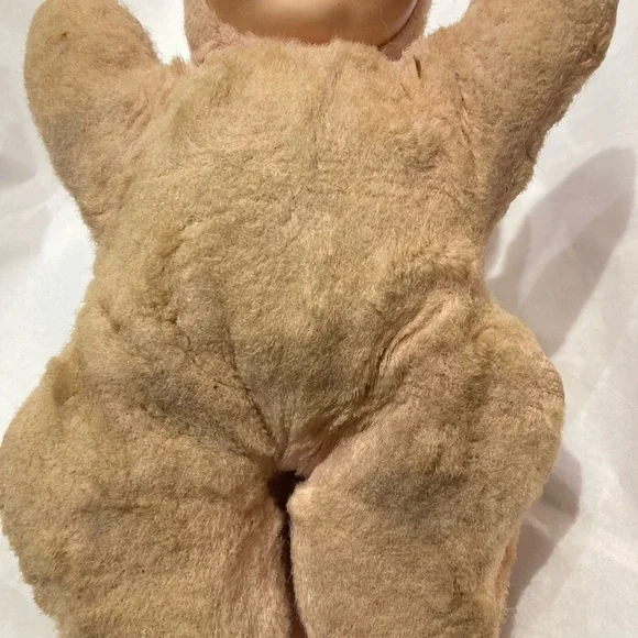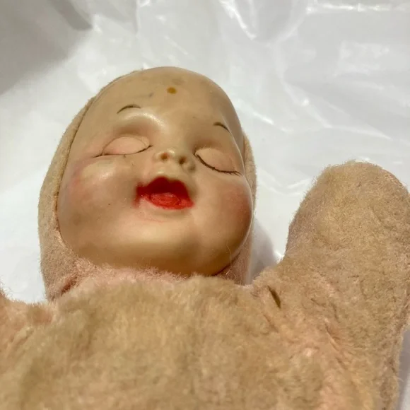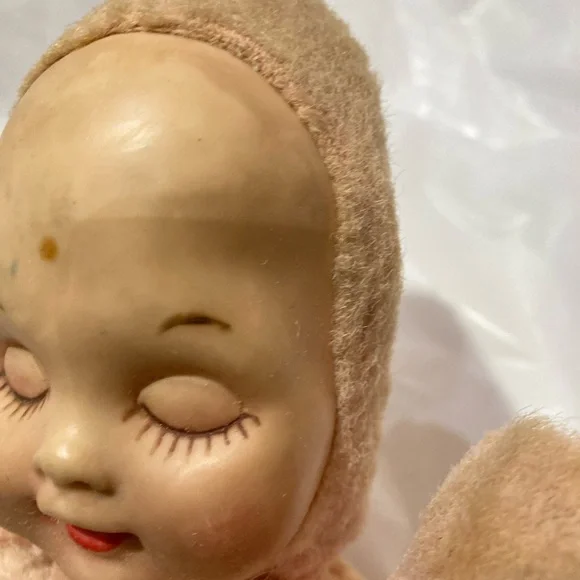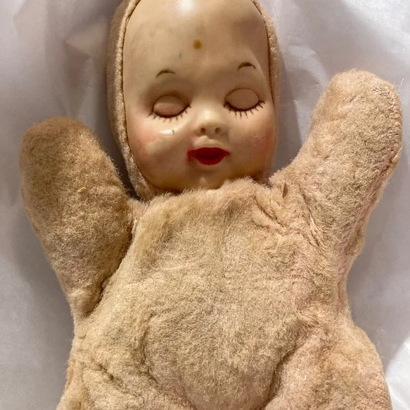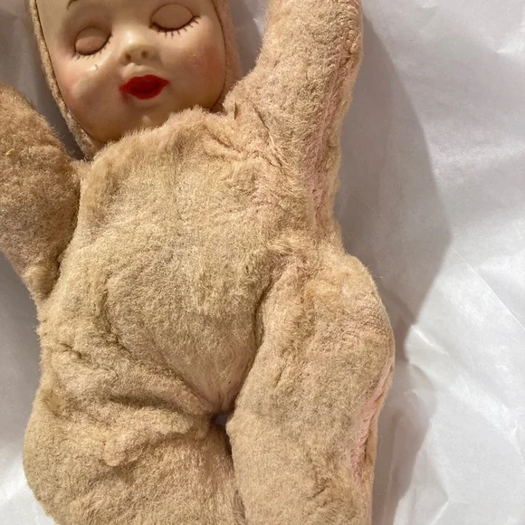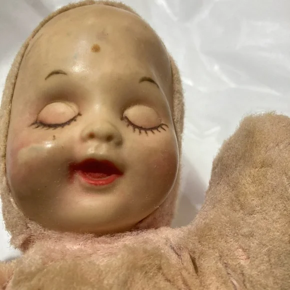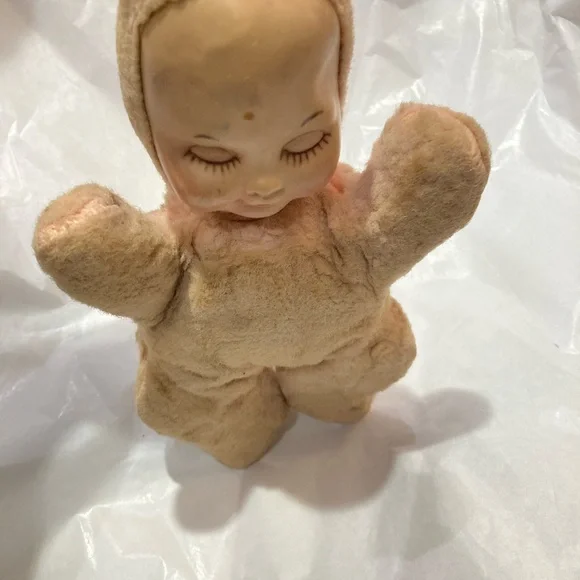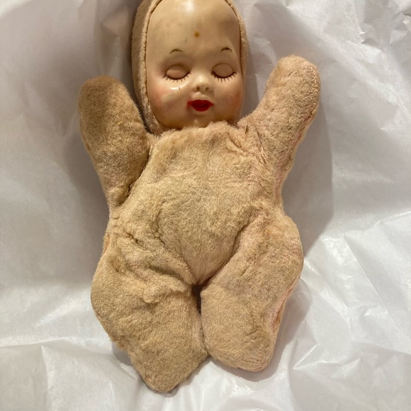 Adorable vintage plush baby doll with a soft tan body. Perfect for collectors.This vintage baby doll is a pale pink in color with a rubber face. She definitely needs to be cleaned up, but I don’t dare do that. There are absolutely no rips or tears in the cloth fabric and no cracks in her sleeping smiling face.