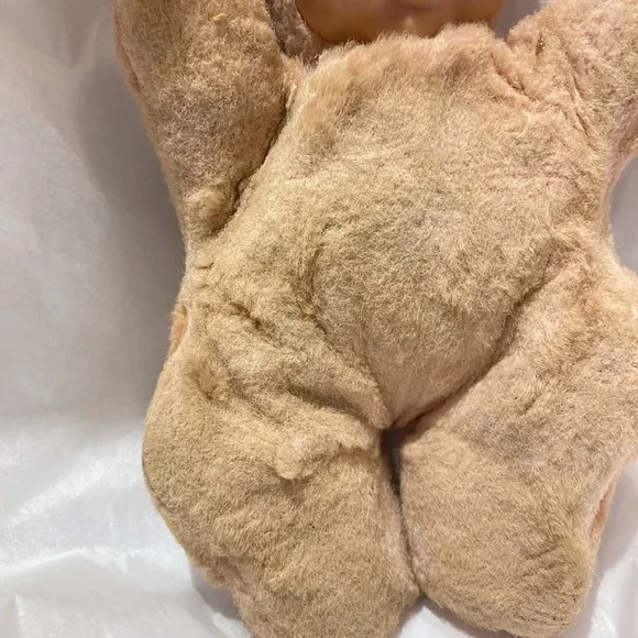 Adorable vintage plush baby doll with a soft tan body. Perfect for collectors.This vintage baby doll is a pale pink in color with a rubber face. She definitely needs to be cleaned...