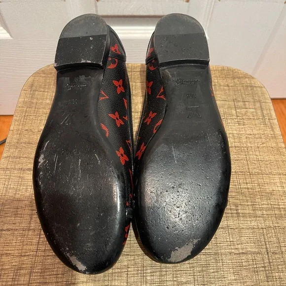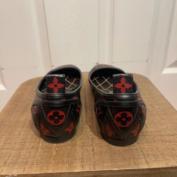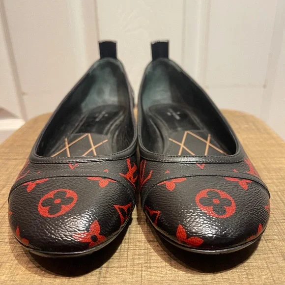LOUIS VUITTON BLACK RED MONOGRAM REVIVAL BALLERINA FLAT SHOES 36.5