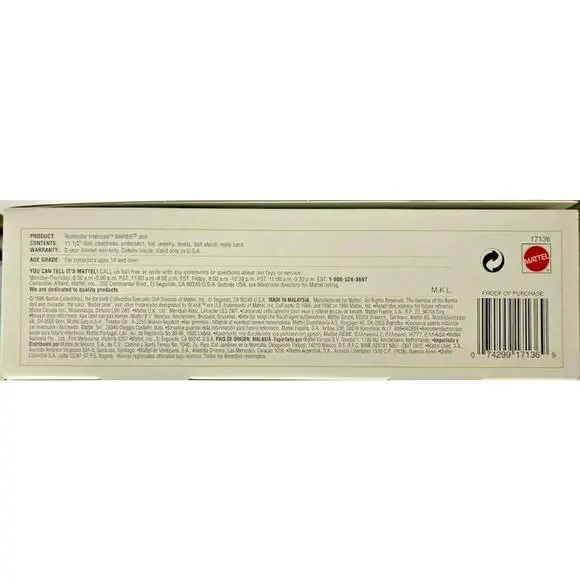 IF you are not satisfied with your purchase PLEASE contact us first to resolve issues beforeleaving negative or neutral feedback. We do offer free returns and refundsYOU, our customer, is valued and we appreciate your business.Items as described: You will allow and Knowingly use all photos as description.PLEASE ASK ALL QUESTIONS PRIOR TO BUYING.All items are described and listed as accurately as possible.All vintage items are sold for display purposes only and to not be consumed or used.Merchandise is old stock from a warehouse in new condition with aging to some packages.Items are sold as is and packages are not opened to preserve the integrity of them.THANK YOU FOR LOOKING AND SHOPPING PLEASE VISIT OUR STORE FORMANY MORE PRODUCTS AND NEW ITEMS EACH WEEK!Barbie #2Character: BarbieEra/Year: 1996Collection: Classique CollectionEthnicity: CaucasianBrand: MattelLabels & Editions: Collector EditionUPC: Does not apply