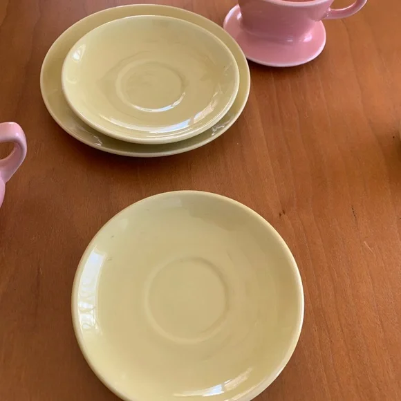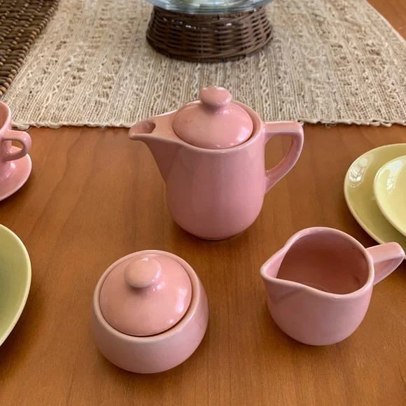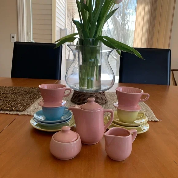 15 piece coffee set includes covered coffee pot (4" ) 2 pour over filters (2" )covered creamer( 2")sugar bowl, 2 cups(2 ")inches, two saucers and two platesIn beautiful vintage pastel colors...very nice condition.