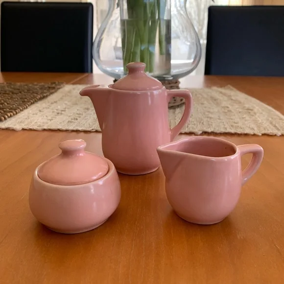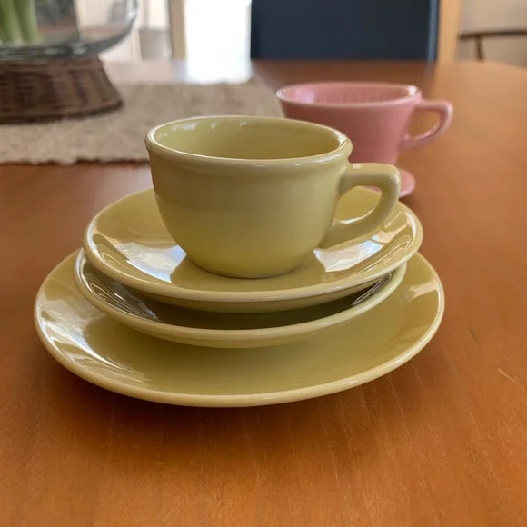 15 piece coffee set includes covered coffee pot (4" ) 2 pour over filters (2" )covered creamer( 2")sugar bowl, 2 cups(2 ")inches, two saucers and two platesIn beautiful vintage...