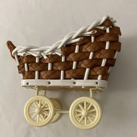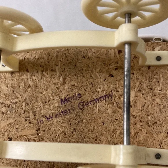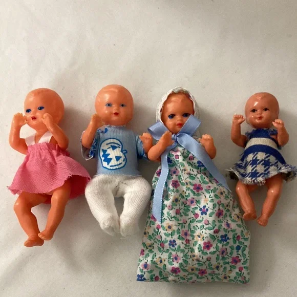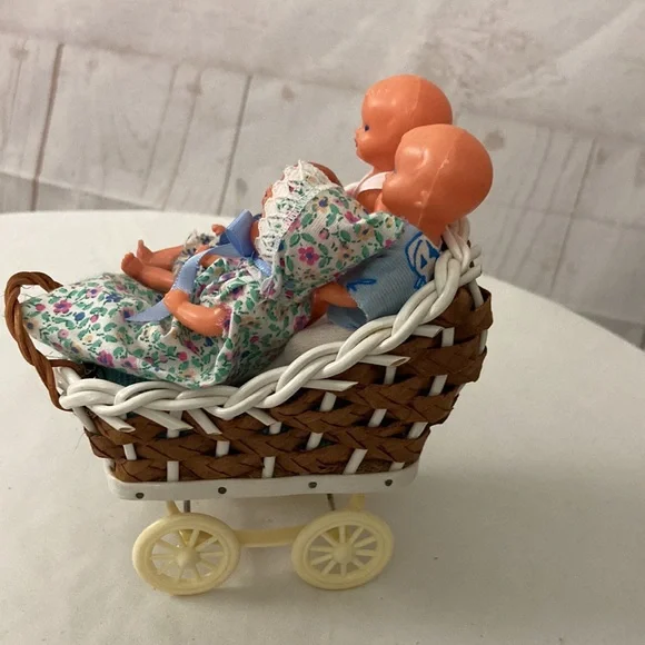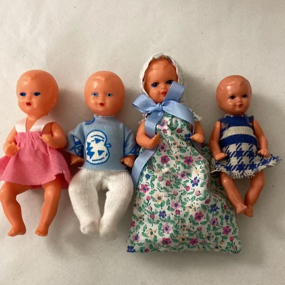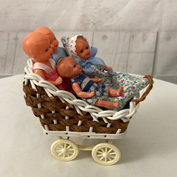 Vintage West Germany miniature Doll & Pram Lot 4 Celluloid plastic Dolls & buggy.In very good condition, the clothes are glued on.Cushions are removable. Super sweet for the vintage doll house.