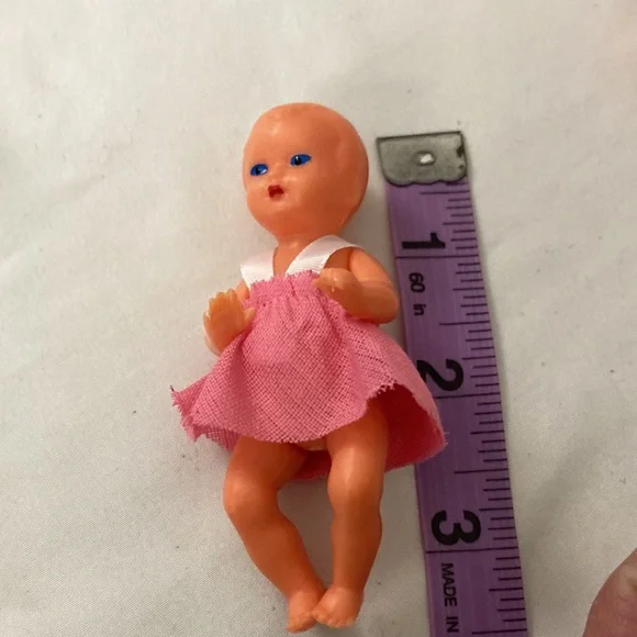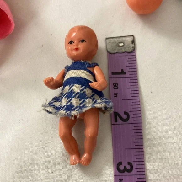 Vintage West Germany miniature Doll & Pram Lot 4 Celluloid plastic Dolls & buggy.In very good condition, the clothes are glued on.Cushions are removable. Super sweet for the...