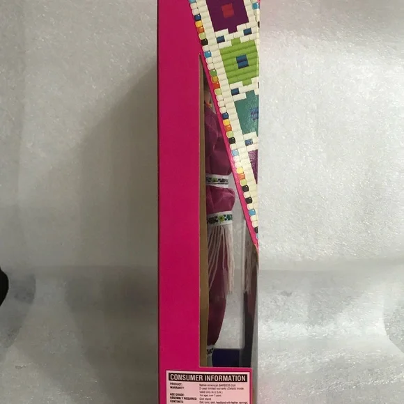 Native American Barbie doll in a vibrant pink outfit. Features intricate beadwork and fringe details.
