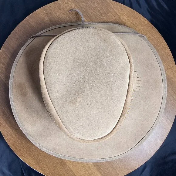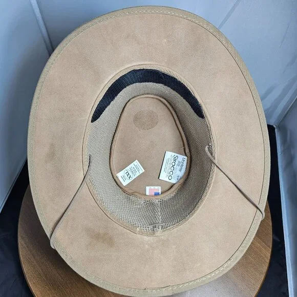 The American outback-style Sirocco Wide Brim Sun Hat is the original enhanced mesh and suede leather hat. The scalloped applique invokes a slightly Western and adventurous feel without the weight that a typical Western hat carries. Featuring a super comfortable removable sweatband liner that attaches securely with velcro tabs sewn into the hat. Made in the USA by American Hat Makers (Head N´ Home Hats)• Brim Measures 2 3/4"• Crown Measures 3 3/4"• Lightweight USA Raised Cowhide Suede Leather | Mesh• Removable Chinstrap Included• Blocks Harmful UV Rays to Keep you Safe• Water-repellent UPF 50 | Perfect Sun Hat• Removable sweatband liner, soft and comfortable• Made in the US• 100% SuedeThis listing is for a size XX-Large. (Hat size: 7 7/8 or Head Measurement of 24 3/8 - 24 7/8") Please check the sizing image before ordering.Check other listings for other sizes and colors if available.Leather is distressed on all hats. (See Pictures and Video)This hat is new and retails for $167 (Not available in this color or suede anymore!)