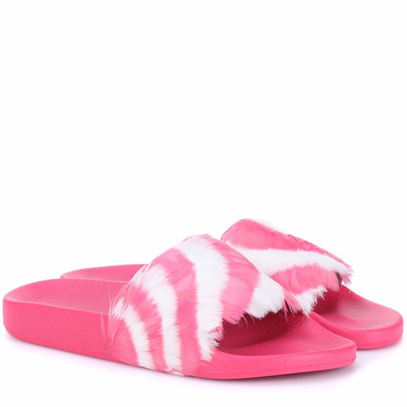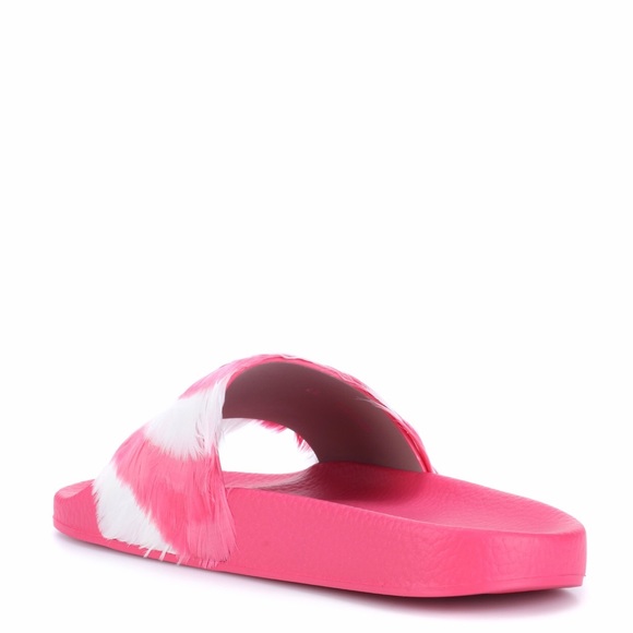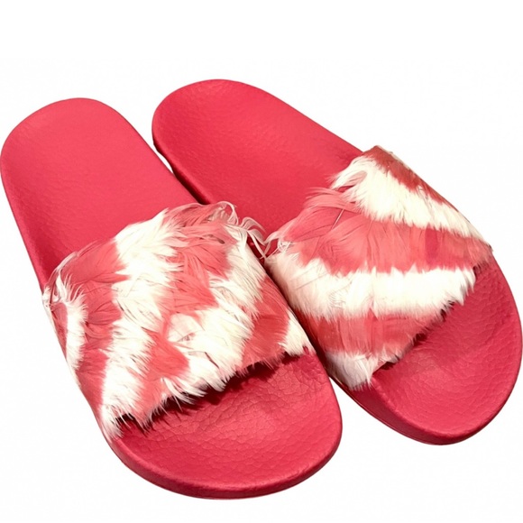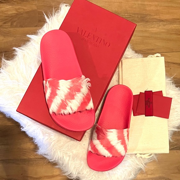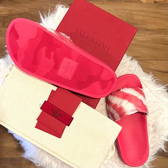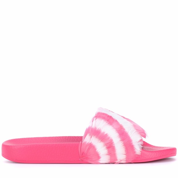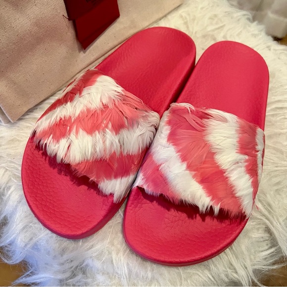 Valentino Garavani slide sandal with feathers -Anatomical molded rubber insole -Outsole embellished with Camouflage motif -Made in Italy-True to size-Color:Shadow pink/Light IvoryA key look this season, this slide receives a high-fashion treatment from Valentino. The laid-back style is adorned with pink and white candy-striped feathers that add visual and textural appear. Seen on the runway at Paris Fashion week, these shoes will add a playful element to a floor-sweeping maxi dress.