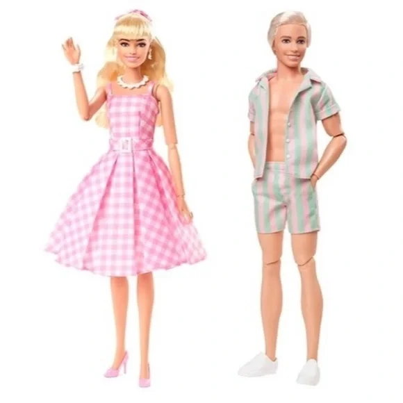 Barbie The Movie Doll Margot Robbie Collectible Wearing Pink Gingham & Ken Doll Wearing Pastel Striped Beach Matching Set Brand New unopened boxesGreetings from Barbie® Land! This Barbie® doll cuts a timeless silhouette in a sweet dress modeled after one of her character’s iconic looks in Barbie™ The Movie. With her pink gingham dress, daisy necklace, and pastel pumps, she’s ready to have the best day ever in Barbie Land! In the likeness of Margot Robbie as Barbie®, this doll makes a great gift for fans and collectors alike. Doll cannot stand alone. Colors and decorations may vary.Barbie The Movie Ken doll! Dressed in a surf-casual outfit, he is having the best day ever in Barbie Land! Ken doll rocks a pastel pink and mint green striped top. The matching shorts even feature working pockets! He looks as easy and breezy as film Ken with his surfboard, platinum blond hair, unbuttoned top, and white sneakers. Featuring a posable body and displayable packaging, this Ken doll makes a great gift for fans and collectors alike!