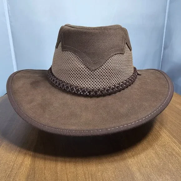 The American outback-style Sirocco Wide Brim Sun Hat is the original enhanced mesh and suede leather hat. The scalloped applique invokes a slightly Western and adventurous feel...