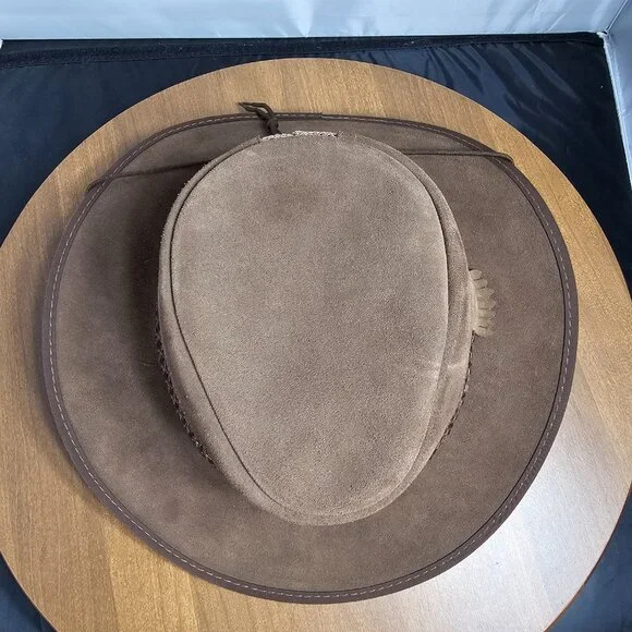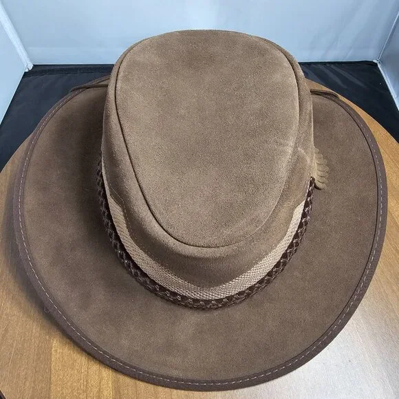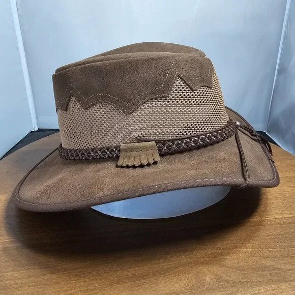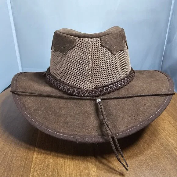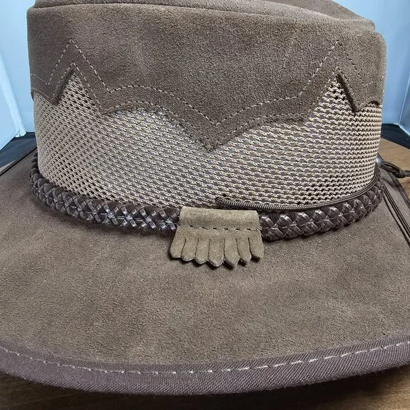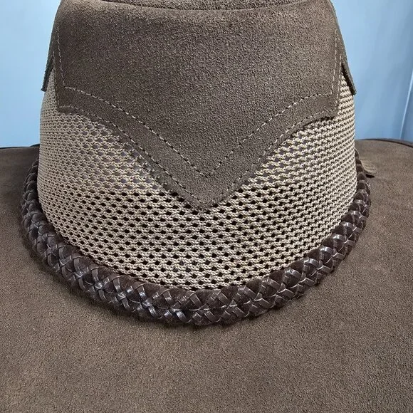 The American outback-style Sirocco Wide Brim Sun Hat is the original enhanced mesh and suede leather hat. The scalloped applique invokes a slightly Western and adventurous feel without the weight that a typical Western hat carries. Featuring a super comfortable removable sweatband liner that attaches securely with velcro tabs sewn into the hat. Made in the USA by American Hat Makers (Head N´ Home Hats)• Brim Measures 2 3/4"• Crown Measures 3 3/4"• Lightweight USA Raised Cowhide Suede Leather | Mesh• Removable Chinstrap Included• Blocks Harmful UV Rays to Keep you Safe• Water-repellent UPF 50 | Perfect Sun Hat• Removable sweatband liner, soft and comfortable• Made in the US• 100% SuedeThis listing is for a size XX-Large. (Hat size: 7 7/8 or Head Measurement of 24 3/8 - 24 7/8") Please check the sizing image before ordering.Check other listings for other sizes and colors if available.Leather is distressed on all hats. (See Pictures and Video)This hat is new and retails for $167 (Not available in this color or suede anymore!)