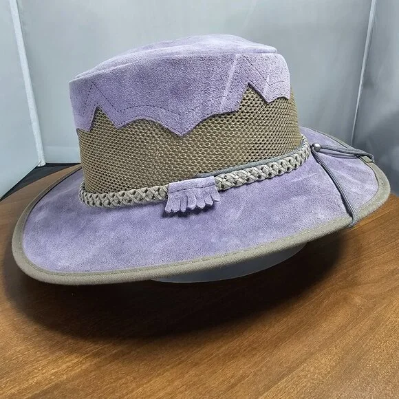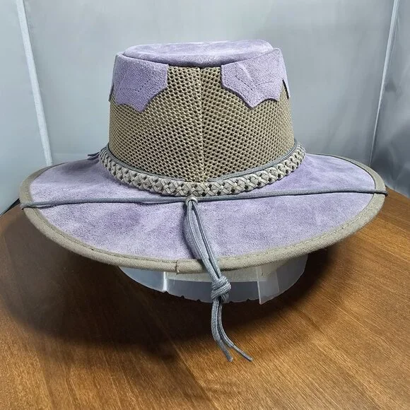 The American outback-style Sirocco Wide Brim Sun Hat is the original enhanced mesh and suede leather hat. The scalloped applique invokes a slightly Western and adventurous feel without the weight that a typical Western hat carries. Featuring a super comfortable removable sweatband liner that attaches securely with velcro tabs sewn into the hat. Made in the USA by American Hat Makers (Head N´ Home Hats)• Brim Measures 2 3/4"• Crown Measures 3 3/4"• Lightweight USA Raised Cowhide Suede Leather | Mesh• Removable Chinstrap Included• Blocks Harmful UV Rays to Keep you Safe• Water-repellent UPF 50 | Perfect Sun Hat• Removable sweatband liner, soft and comfortable• Made in the US• 100% SuedeThis listing is for a size X-Large. (Hat size: 7 5/8 or Head Measurement of 23 5/8 - 24 1/4") Please check the sizing image before ordering.Check other listings for other sizes and colors if available.Leather is distressed on all hats. (See Pictures and Video)This hat is new and retails for $167 (Not available in this color or suede anymore!)