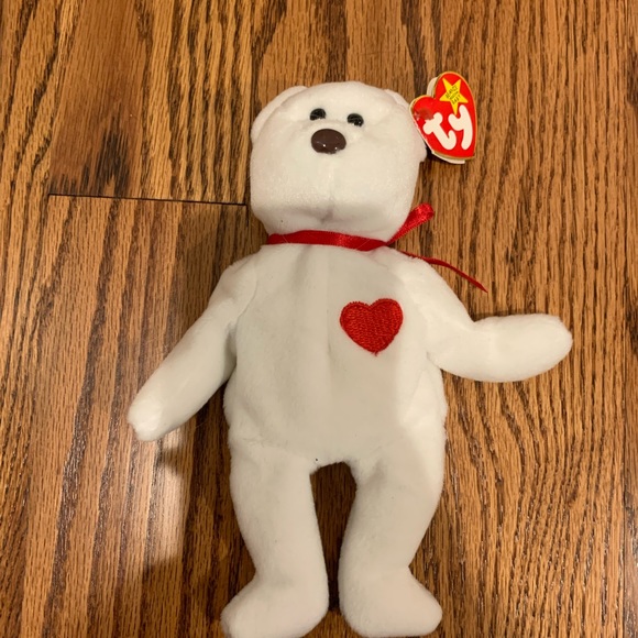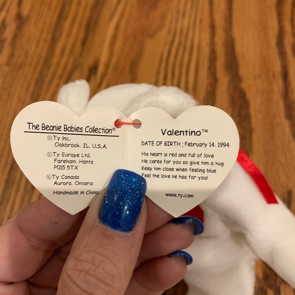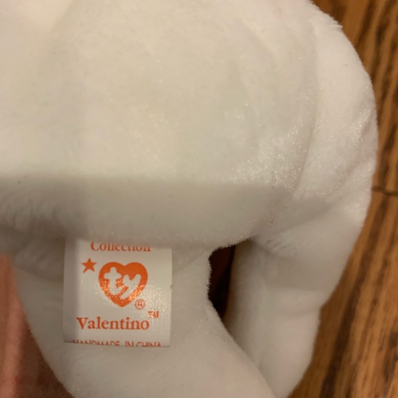 ULTRA RARE - Tag ERRORS & Eye/Nose Errors - Ty Beanie Baby Valentino. Tag is not in prestige condition..crinkles on tag... see pictures. Brown Nose/Black eyes´Original´ spelled wrong on tag´Surface´ spelled wrong on back of tagTags don´t match in dates (1993/1994)Extra space between ´handmade´ and ´in´PVC PelletsA comma after Il instead of period No comma after OakbrookSemicolon after birthdate instead of colon
