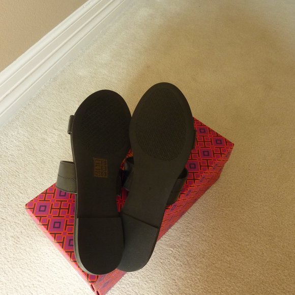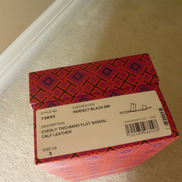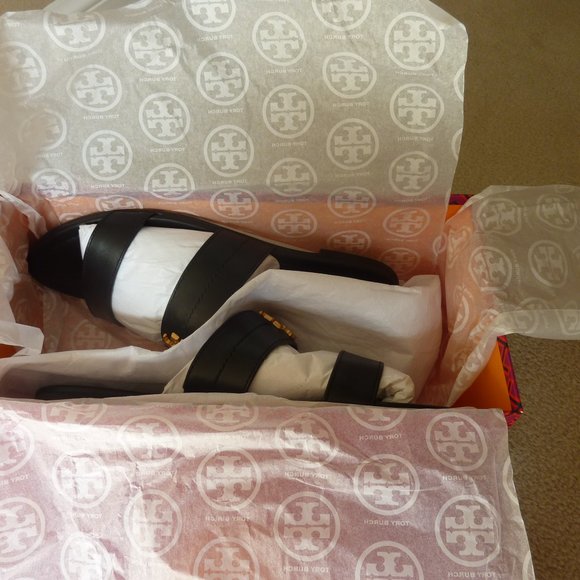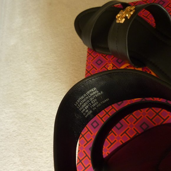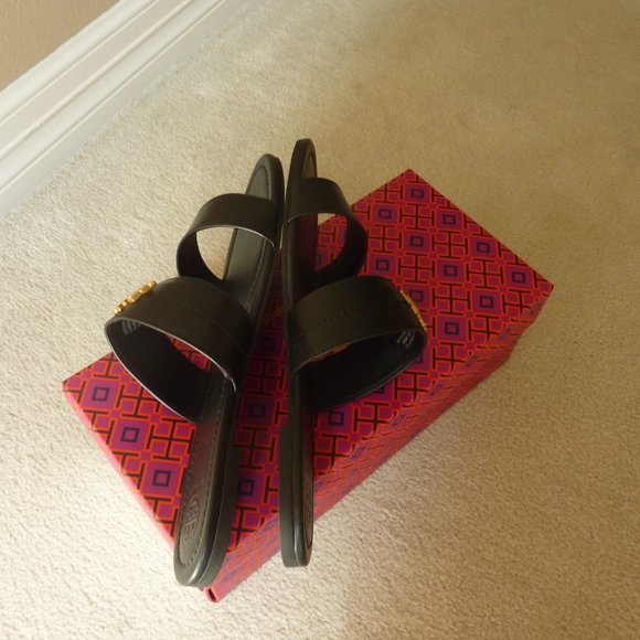 *NEW in box (no dust bag)* MSRP of $248.00Tory Burch´Everly´ Two-Band Leather Sandals, Sz. 8 (Black)black calf leather two-band style w/ open toegold-toned logo T emblem lightly padded leather insole rubber sole with traction model: 73853imported