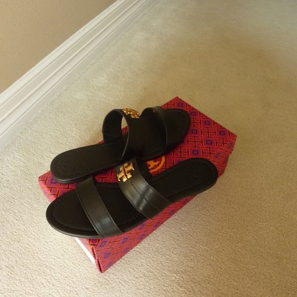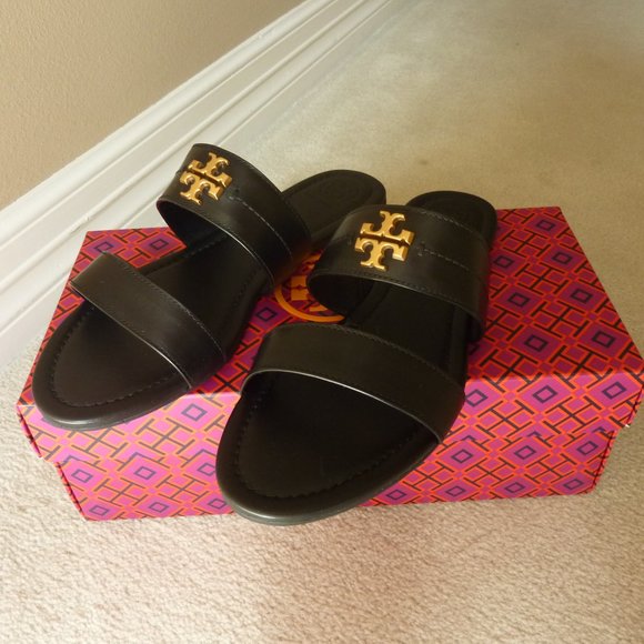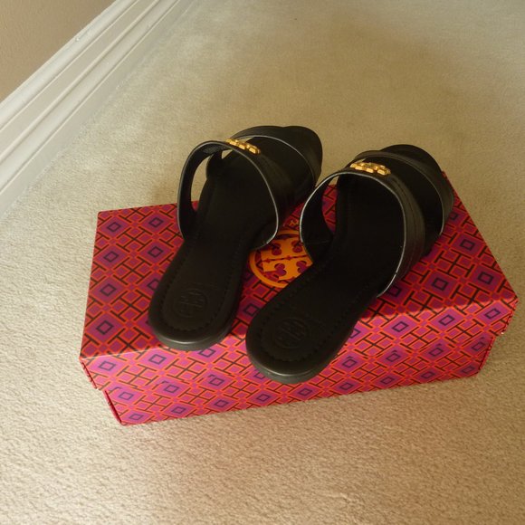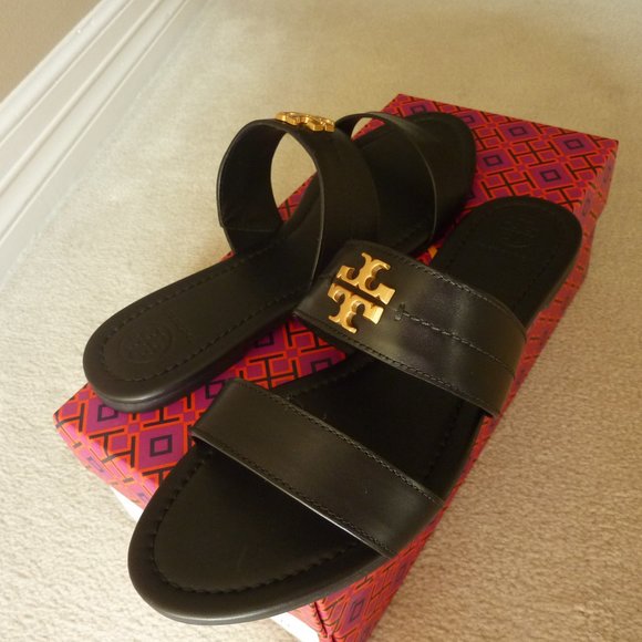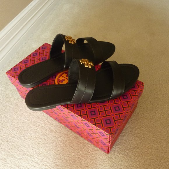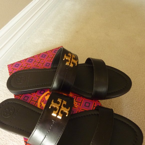 Tory Burch ´Everly´ Black Leather 2-Band Logo-T Sandals (New in Box) - Sz. 8B