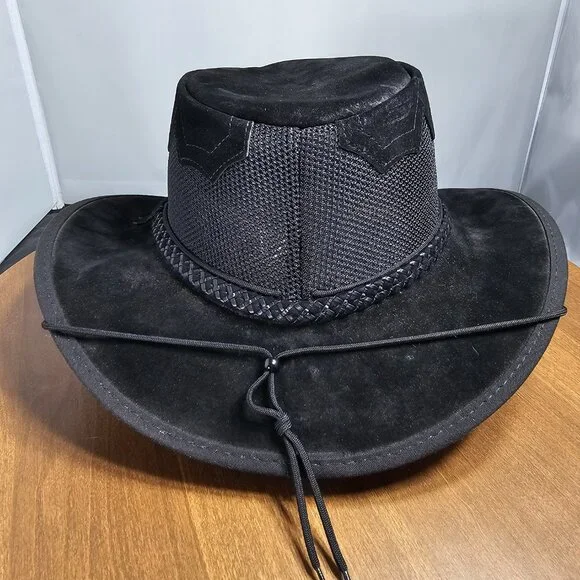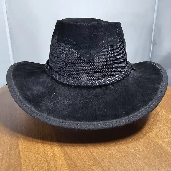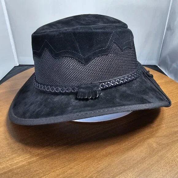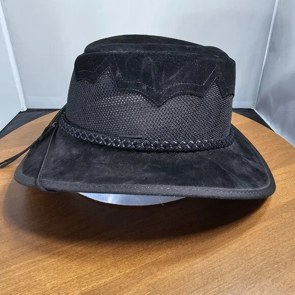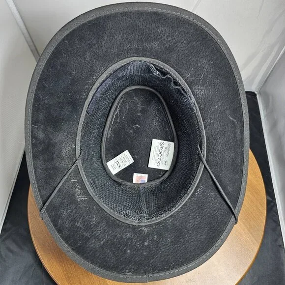 The American outback-style Sirocco Wide Brim Sun Hat is the original enhanced mesh and suede leather hat. The scalloped applique invokes a slightly Western and adventurous feel without the weight that a typical Western hat carries. Featuring a super comfortable removable sweatband liner that attaches securely with velcro tabs sewn into the hat. Made in the USA by American Hat Makers (Head N´ Home Hats)• Brim Measures 2 3/4"• Crown Measures 3 3/4"• Lightweight USA Raised Cowhide Suede Leather | Mesh• Removable Chinstrap Included• Blocks Harmful UV Rays to Keep you Safe• Water-repellent UPF 50 | Perfect Sun Hat• Removable sweatband liner, soft and comfortable• Made in the US• 100% SuedeThis listing is for a size XX-Large. (Hat size: 7 7/8 or Head Measurement of 24 3/8 - 24 7/8") Please check the sizing image before ordering.Check other listings for other sizes and colors if available.Leather is distressed on all hats. (See Pictures and Video)This hat is new and retails for $167 (Not available in this color or suede anymore!)