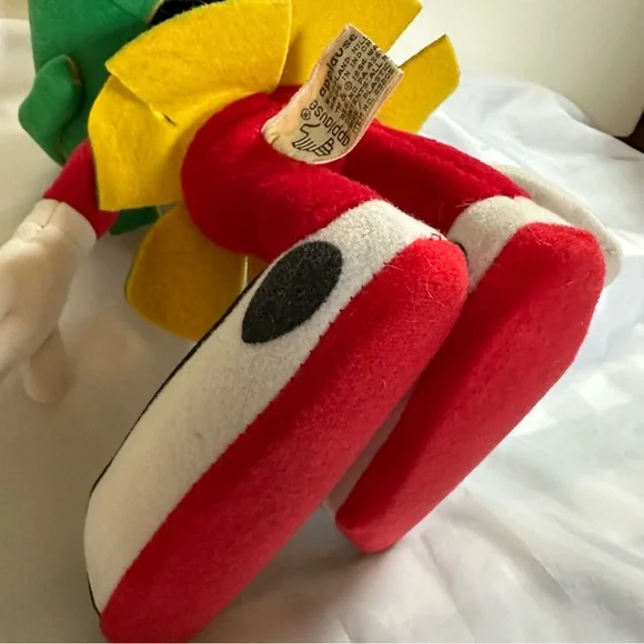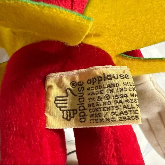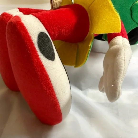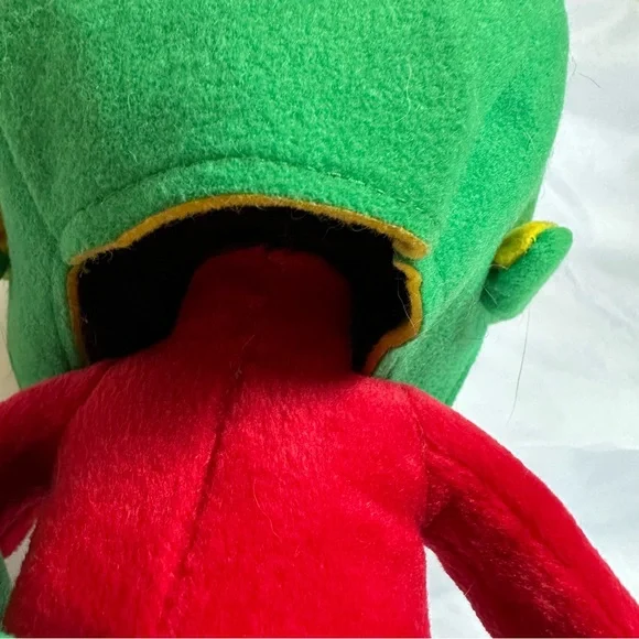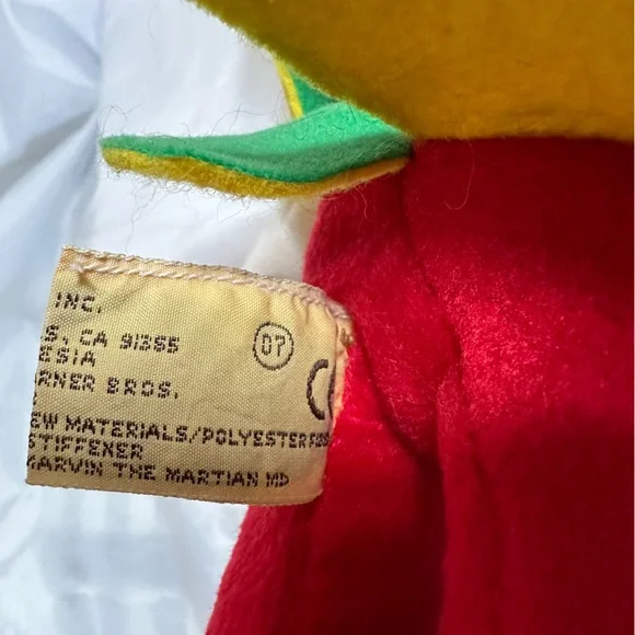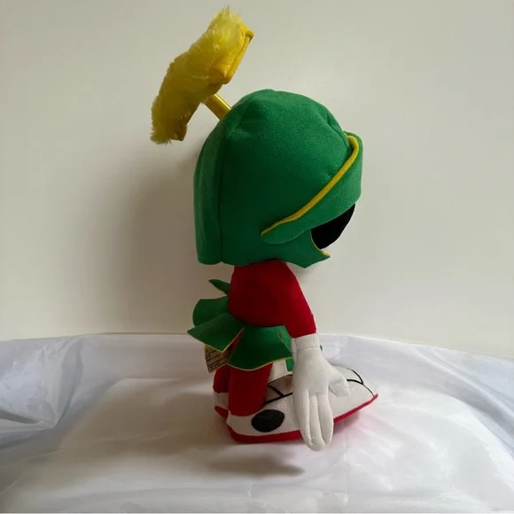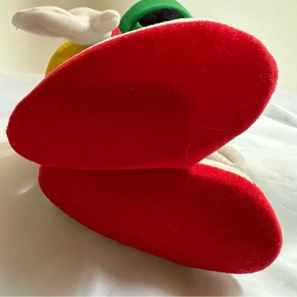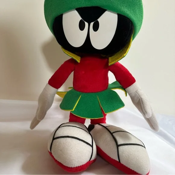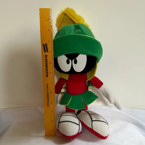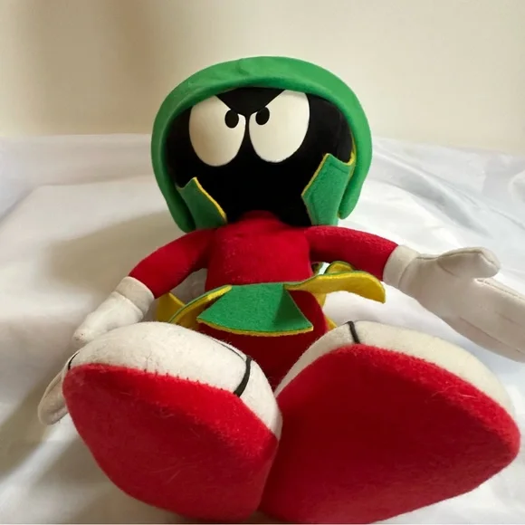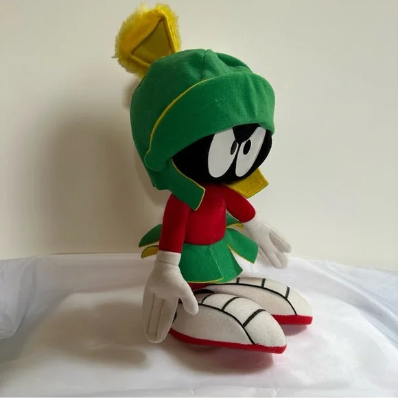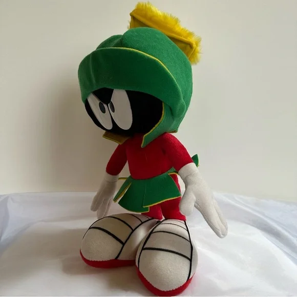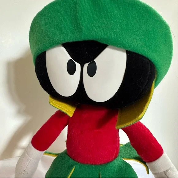 This delightful stuffed toy is about 13" tall.Marvin is in excellent used condition and has never been played with; instead he has stood on a book case frowning upon the whole world for the past 29 years.His colors remain bold and has not faded over time since he has been kept out of the sunlight.He sports a green felt helmet with flaps and a yellow Martian psychonic scrambler that feels soft and plush.His body is made of red felt, with green skirt and yellow ´lining"His large shoes are white with black trim and red soles.His gloved hands are also of a felt material.This toy is not soft and cuddly; instead, it is fairly stiff so that it can remain in a standing position.In Excellent Used Condition1994 - Applause Warner Bros.GiftsFather´s DayMother´s DayPresentsGraduationChristmasKidsActivities