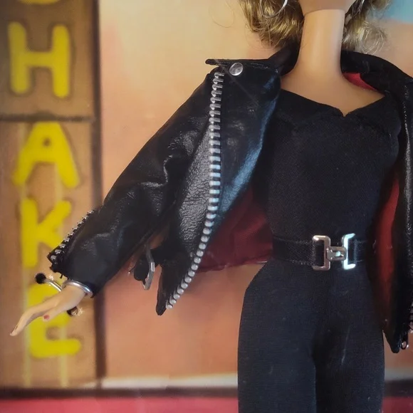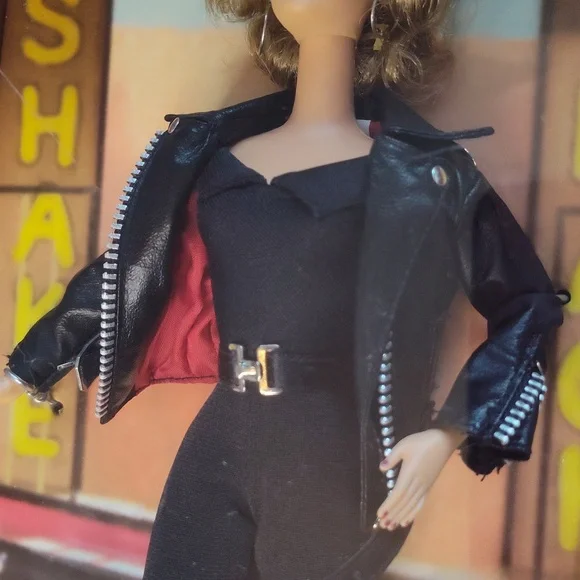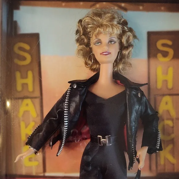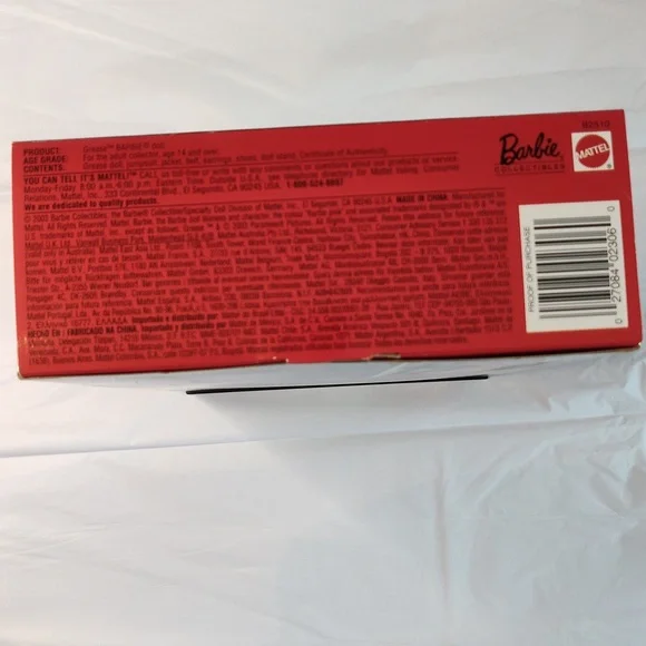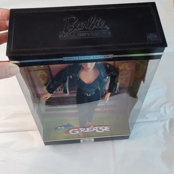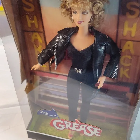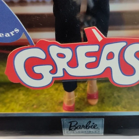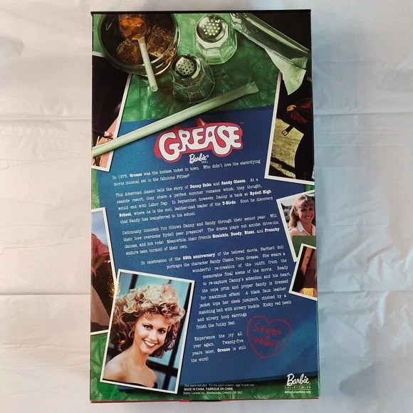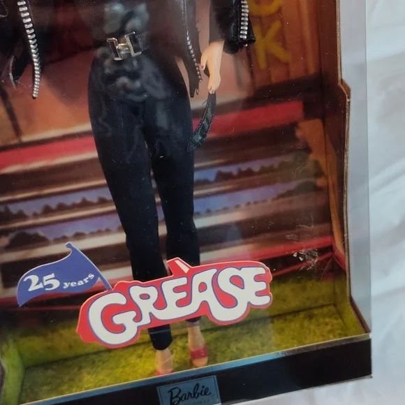 Never Removed From Box (NRFB), sealed, never opened. Last photo is a vintage modeled Mattel photo.Box has slight wear from storage. There is also something on the front which I have not tried to clean. Please see photos for details.In celebration of the 25th anniversary of the beloved movie Grease, Barbie doll portrays the character Sandy Olsson. She wears a sassy re-creation of the outfit from the memorable final scene of the movie. Ready to re-capture Danny´s attention and his heart, the once prim and proper Sandy is dressed for maximum effect! A black faux leather jacket tops her sleek jumpsuit, cinched by a matching belt with silvery buckle. She tops off her ensemble with curly sandy blond hair, kicky red heels, and silvery hoop earrings. Twenty-five years later, Grease is still the word!Edition: Collector EditionCollection: Grease Barbie DollsRelease Date: 6/1/2003