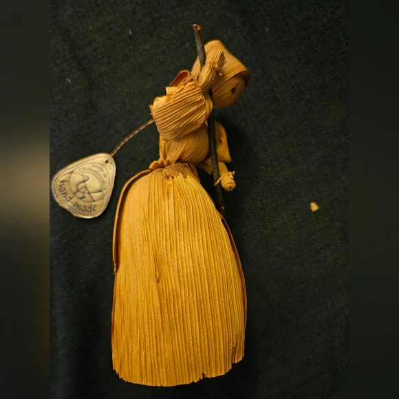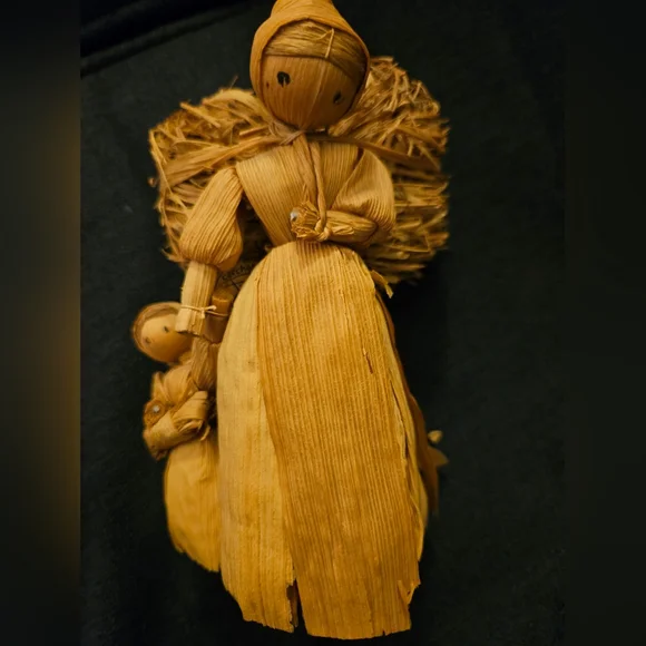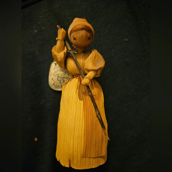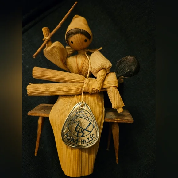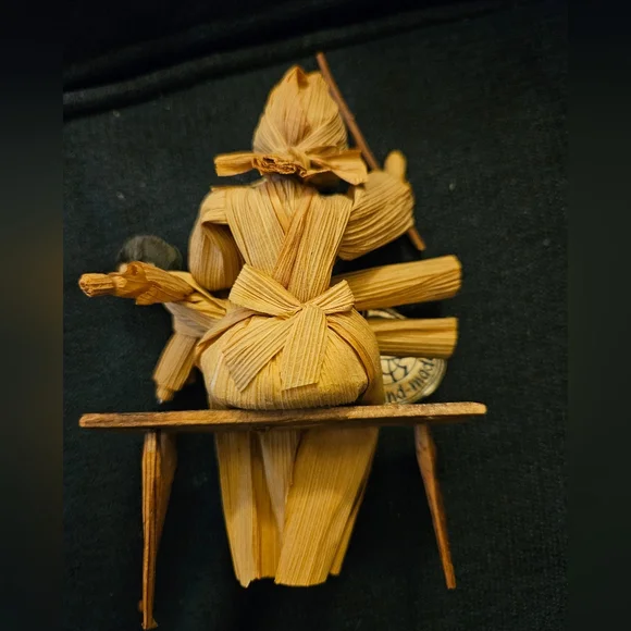 These are 3 vintage corn husk dolls all with their original tags. All in good shape but the corn husk doll spanking kid on bench has one broken leg on the bench. see photo.