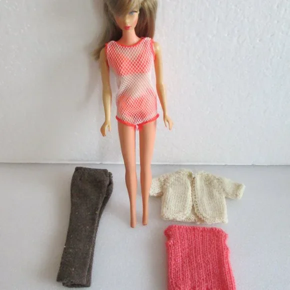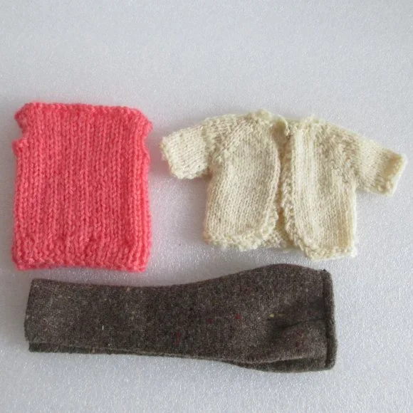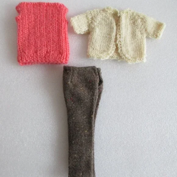 Adorable 3-pc set of original vintage BARBIE "winter sportswear".Includes:Wool tweed trousersIvory knit cardigan sweater.Pink sleeveless knit sweater.(Doll not included - see other listings!)Excellent vintage condition.From original owner. Smoke free/pet free home.