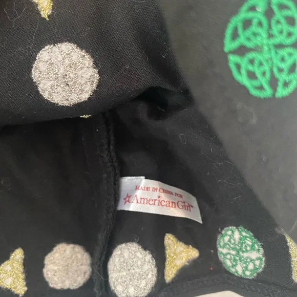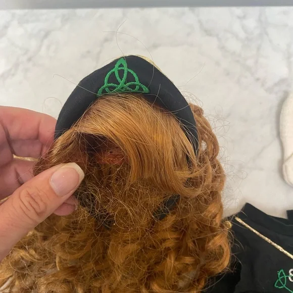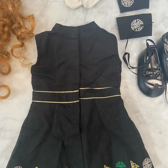American Girl Irish dance costume in black, green and gold. In good condition. Rare and retired. Includes dress, wig & headband, cuffs and poodle socks. Shoes are NOT included.