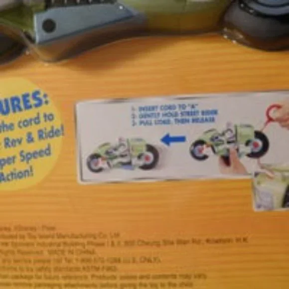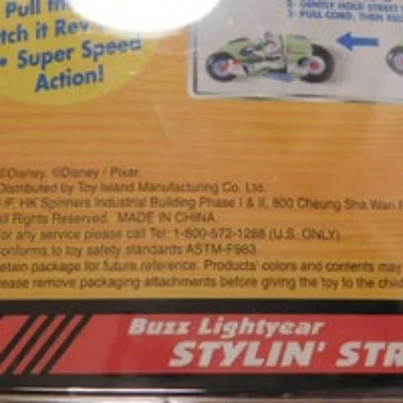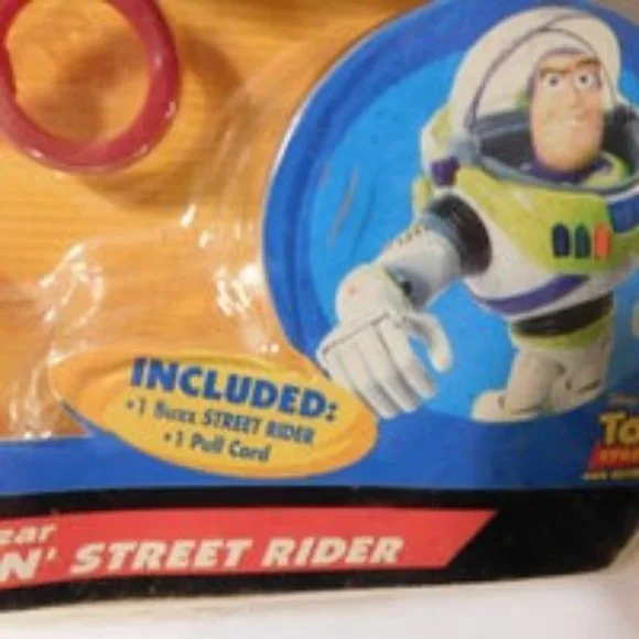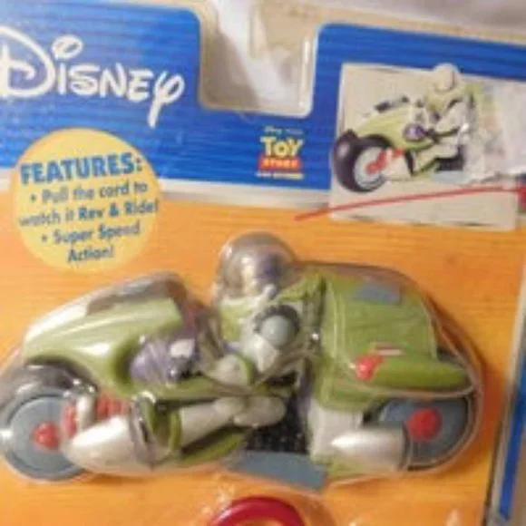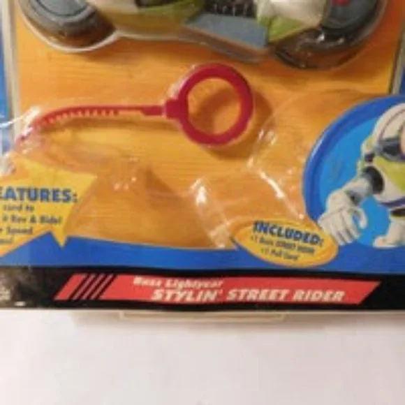 Buzz Lightyear Toy Story Disney Stylin´ Street Rider Motorcycle Pull Toy. Rare hard to find toy. Brand new in factory sealed package.The plastic packaging has some shelf wear/creases.Pull the cord to watch it rev & ride.Includes 1 Buzz Street Rider and 1 pull cord.Toy measures approx. 5" long