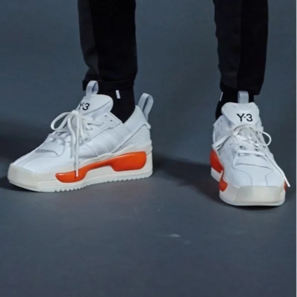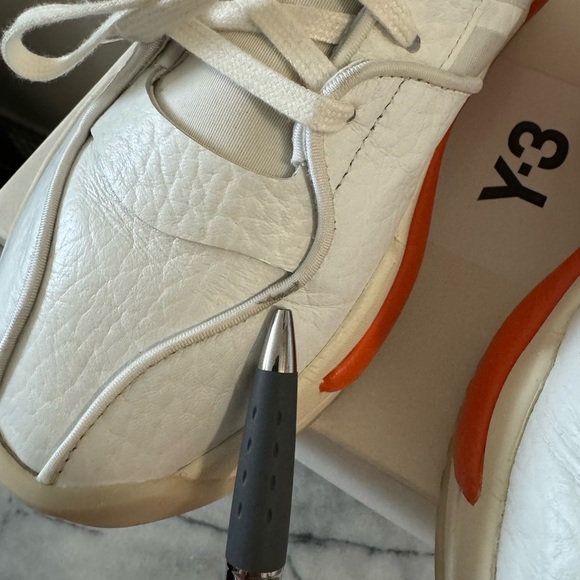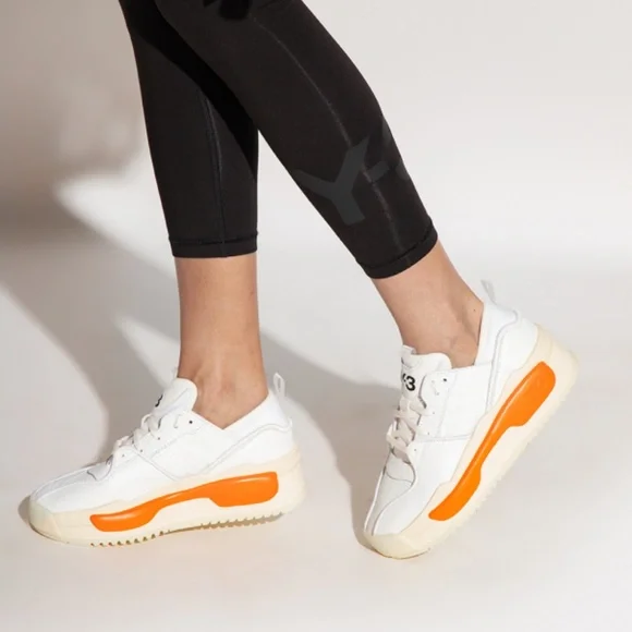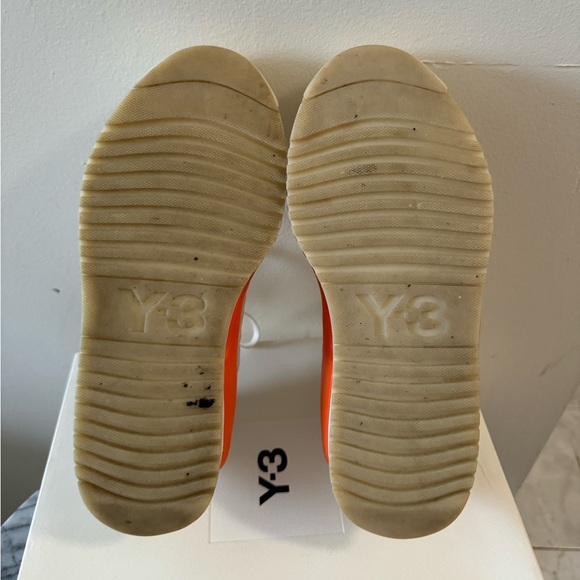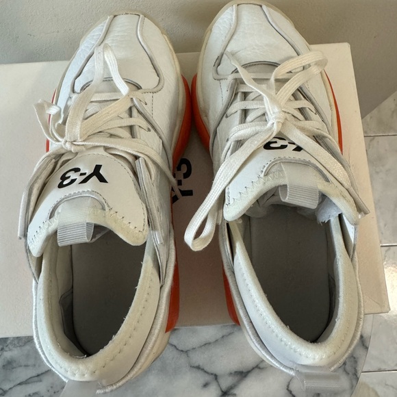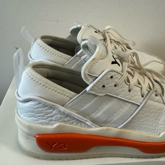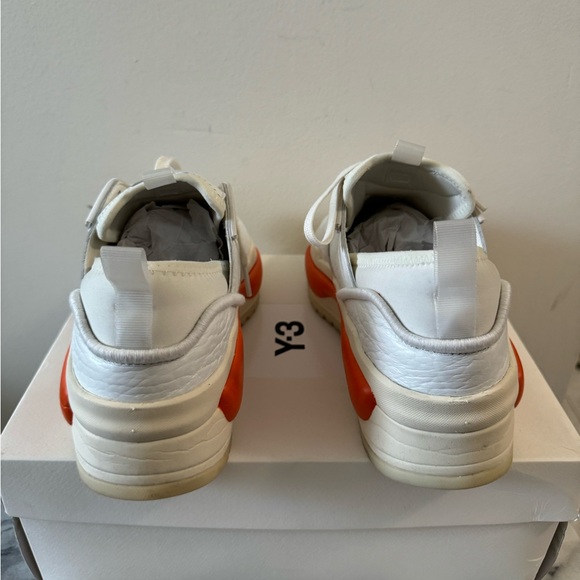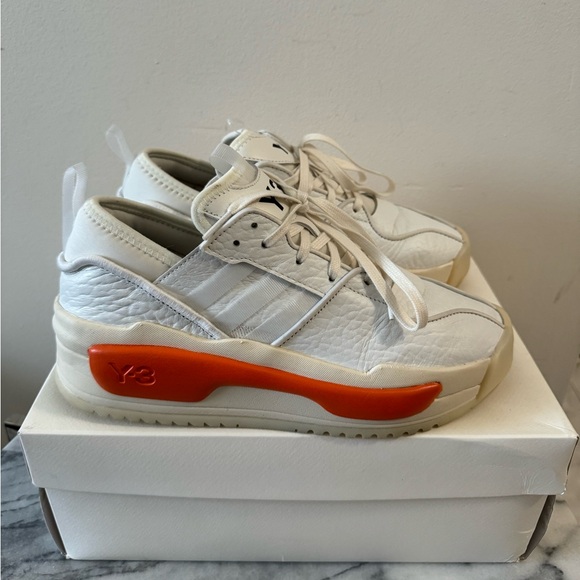 Wore twice, great condition, comes with box, dust bag and extra laces. UNISEX. US size Women´s 9.5, Men´s 7.5. One little scratch, check pictures please. Retail price about $350 plus tax.- Six hole lace up closure.- Neoprene lining with grey suede heel.- White removable PORON® cushioned insole.- Cream white rubber toe cap.- Tonal leather tongue patch. - Tonal embroidered heel piping detail.- See-through mesh heel and tongue pull tabs.- Cream white two-layer textured platform EVA midsole with orange molded plugs.- See-through floating mesh 3-Stripes branding on sides.- Logos: black ´Y-3´ graphic print logo on tongue patch, embossed ´adidas Y-3´ print logo on insole, debossed ´Y-3´ print logo on lateral side plug.Upper: heavy tumbled leather and neoprene. Sole: rubber.Supplier Color: Core White/Cream White/Orange