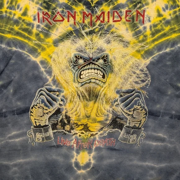 Amazing true vintage band grail from Iron Maiden in size XL. Distressed 1980´s "Live After Death" symmetria single stitched tie dye t-shirt. Holes and staining as pictured adds classic patina and authenticity to this legendary piece!Measurements are provided in photos. All products are locally thrifted/rescued and will require wash before wear. Most pieces will show normal wear for vintage items of 20-30 year age. I ship the same, or next day depending on the order time, from the East Coast. Thank you!