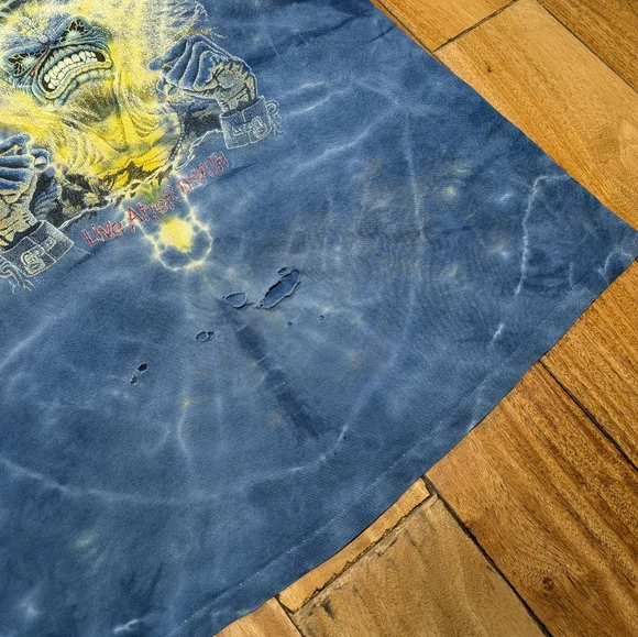 Amazing true vintage band grail from Iron Maiden in size XL. Distressed 1980´s "Live After Death" symmetria single stitched tie dye t-shirt. Holes and staining as pictured...