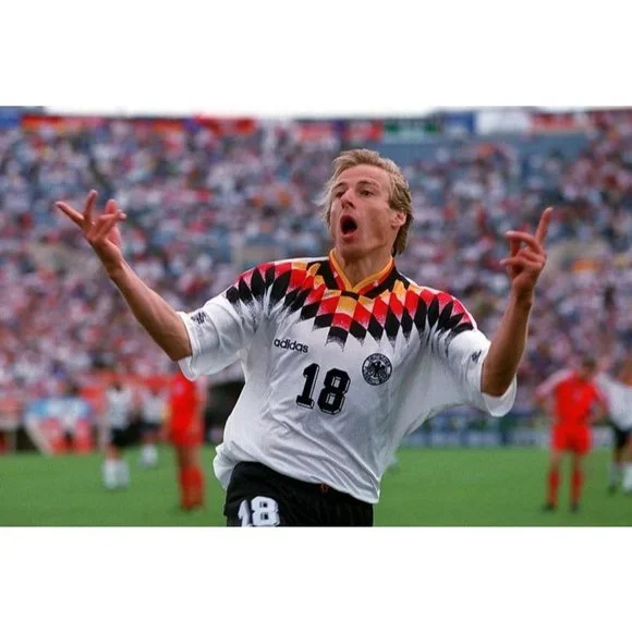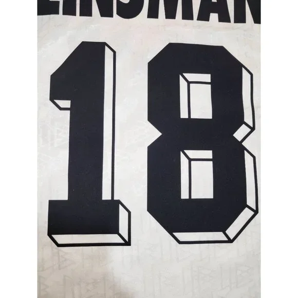 Official Jurgen Klinsmann HomeJersey from the 1994 World Cup held in the USA. PLEASE READ!!!!THIS SHIRT IS NOT A REMAKE! IT IS FROM THE ERA AND AUTHENTIC!THE NAME SET IS OF VELVET/FLOCK MATERIAL!The SIZE IS L! It is in EXCELLENT CONDITION! I´d give it a 9/10 in condition.Bayern Munich Munchen Deutschland Borussia Dortmund USA US USMNT MLS Tottenham Hotspur Football Soccer Shirt Trikot