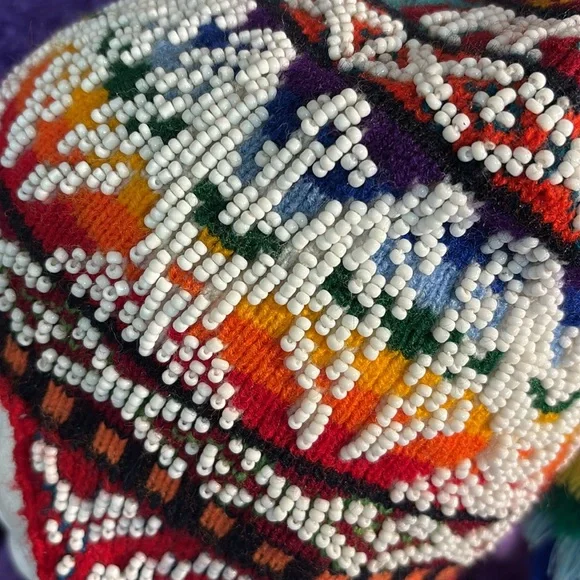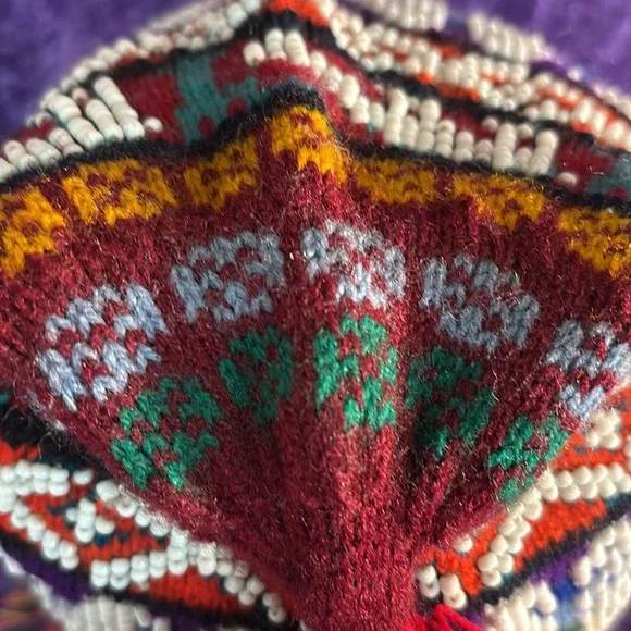 Vibrant knit hat adorned with colorful beads. Features red tassels and intricate patterns. All hand beaded