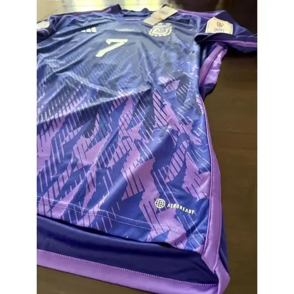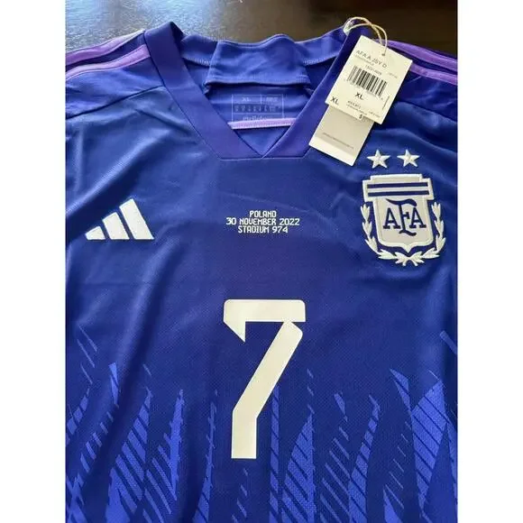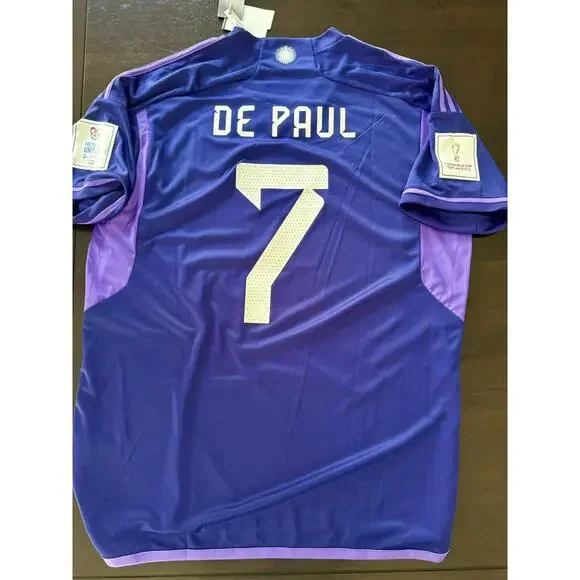 Show your support for the Argentine national soccer team with this authentic Adidas away jersey featuring the number 7 and the name De Paul in honor of Rodrigo De Paul. This jersey is officially licensed and made with high-quality materials to ensure maximum comfort and durability. It is available in size XL and is designed for men.The jersey is inspired by the Qatar 2022 event/tournament and is perfect for any soccer fan. It is a great addition to any collection of sports memorabilia and fan apparel. Make a statement with this purple jersey that features the Argentine team logo and the Adidas logo. This jersey is a must-have for any soccer enthusiast!