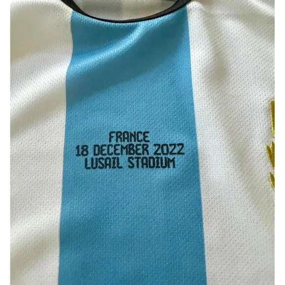 Relive one of the most iconic moments in football history with this Lionel Messi Argentina 2022 World Cup Final Stadium Version Jersey – commemorating Argentina’s legendary victory over France in Qatar.Stadium Version – Designed for fans, featuring stitched details, standard fit, and breathable fabric.Qatar 2022 Final Edition – Unforgettable final where Messi led Argentina to glory.Official Design – Includes Argentina crest, #10 Messi printing, and authentic FIFA World Cup patches.Condition: Brand new Shipping: Fast, secure, and tracked.A must-have for Messi fans and collectors of historic football memorabilia.100% authentic – Buy with confidence from a trusted seller.
