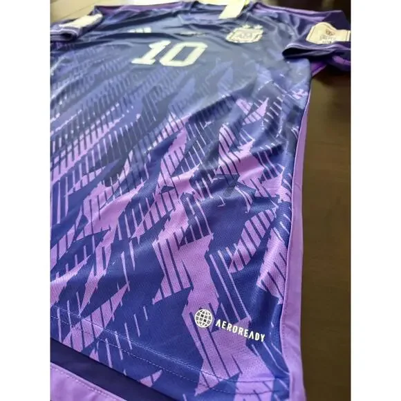 Show your support for Argentina´s soccer team with this authentic Adidas away jersey. The jersey features the number 10 and the name Messi on the back, making it a must-have for any fan of Lionel Messi or Argentine soccer. This jersey is officially licensed and made with high-quality materials to ensure comfort and durability.The jersey is a size XL and features a striking purple color that will make you stand out in any crowd. It´s perfect for wearing to games, festivals, or just out and about to show off your love for soccer and Argentina. Don´t miss out on this opportunity to own a piece of soccer history and show your support for Argentina in style.