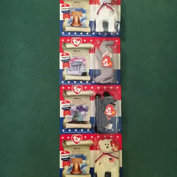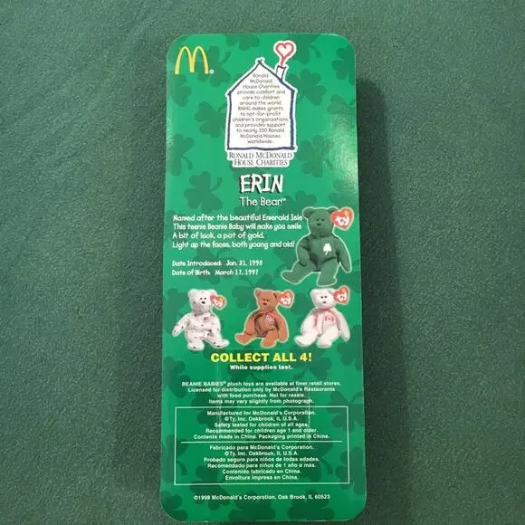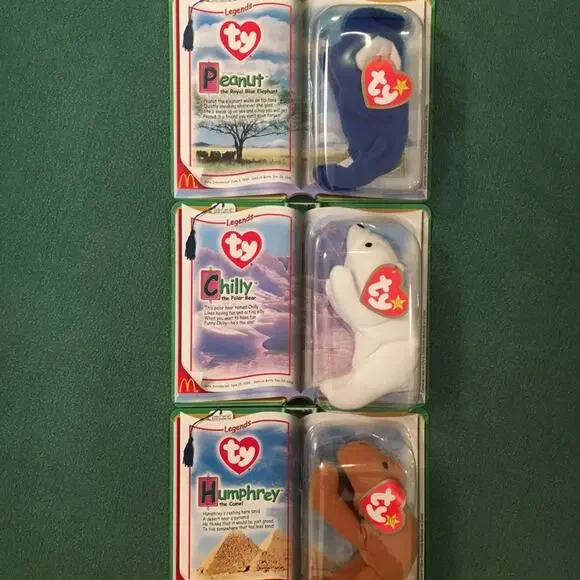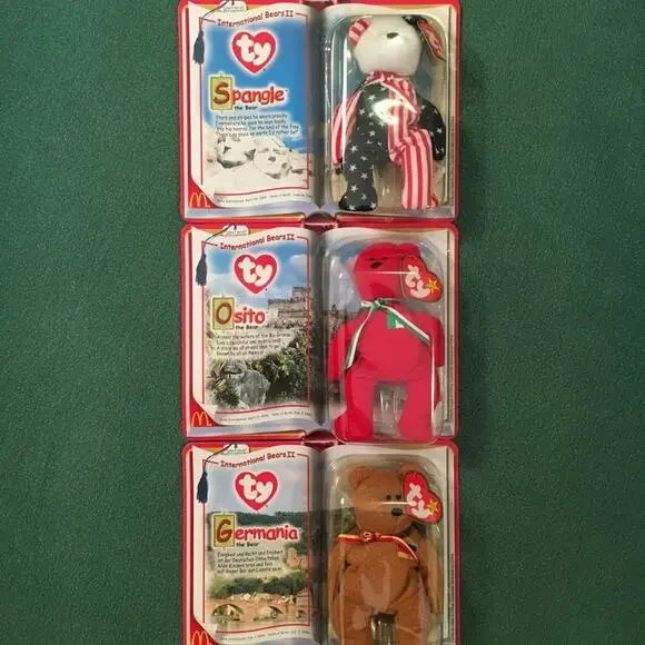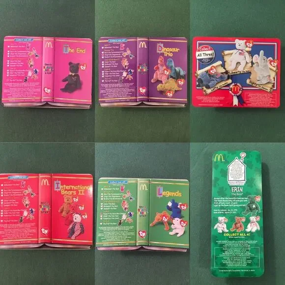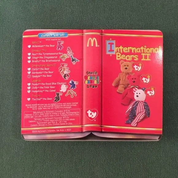 SELLING AS A LOT OF 15. All Beanies are in mint condition, unopened, and in original packaging. From McDonald’s, 2000.Set of 3: International Bears II (Spangle, Osito, Germania); Set of 3: Legends (Humphrey, Chilly, Peanut); Set of 3: Dinosaur Trio (Bronty, Rex, Steg); Set of 4: American Trio (2 Libearty bears, 1 Lefty, 1 Righty); Erin the Ireland Bear; The End Bear.