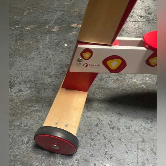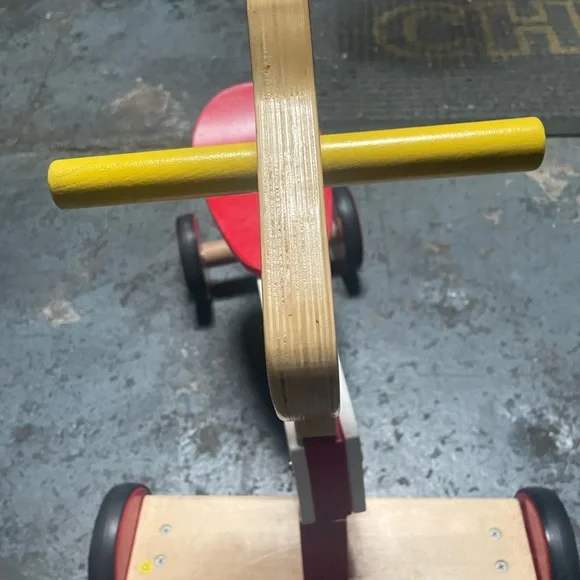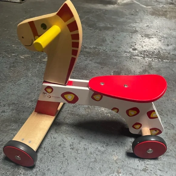 Hape wooded toddler 4 wheel non motorized balance bike for a toddler to scoot around age 1.5-4 would be best in a giraffe prone themed character head (looks a little bit like a hoarse ) in red and white with non marking wheels . This was used indoor 95% by one child and is euc but preowned so no original box . Toy scooter bike tricycle balance bike strider wooden cart push toy moving non pedal