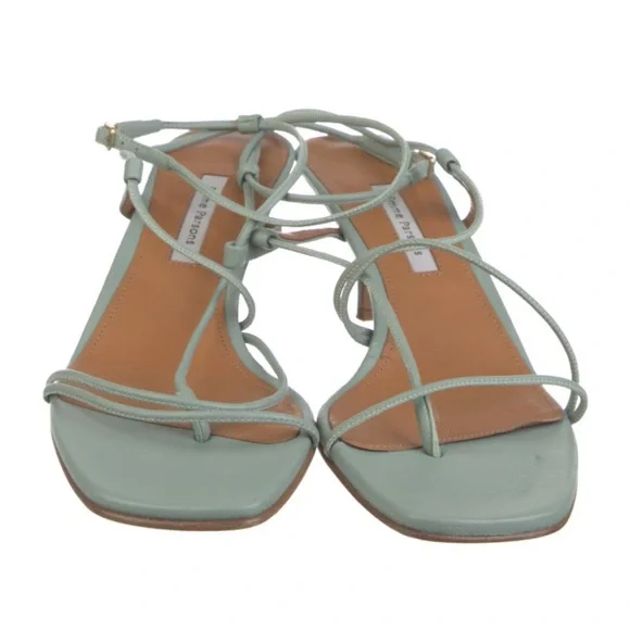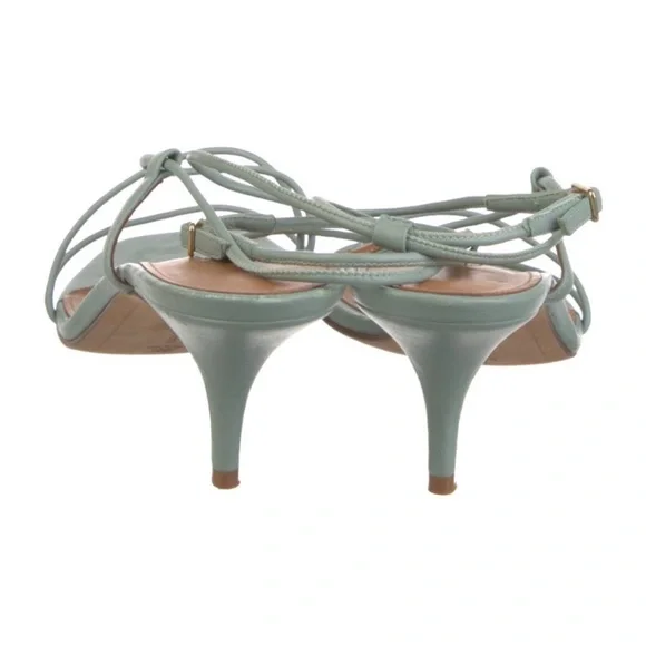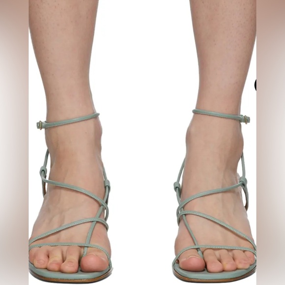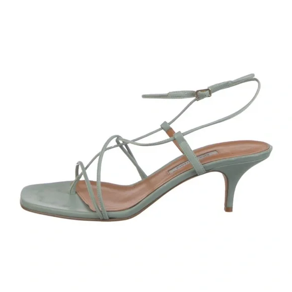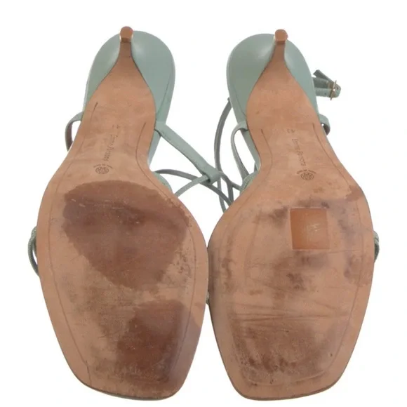 PRODUCT DETAILSHeel HeightApprox. 2 InchesMaterialBuffed CalfskinHeel TypeStilettoSole MaterialLeatherToe StyleOpen Square ToeClosureAdjustable Ankle Strap With Pin-Buckle FasteningHardwareSilver-ToneBrandEMME PARSONSColor330 CeledonGoop favorite Worn a couple of times.Excellent condition as shown.