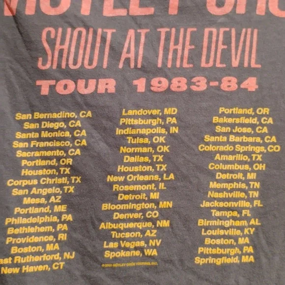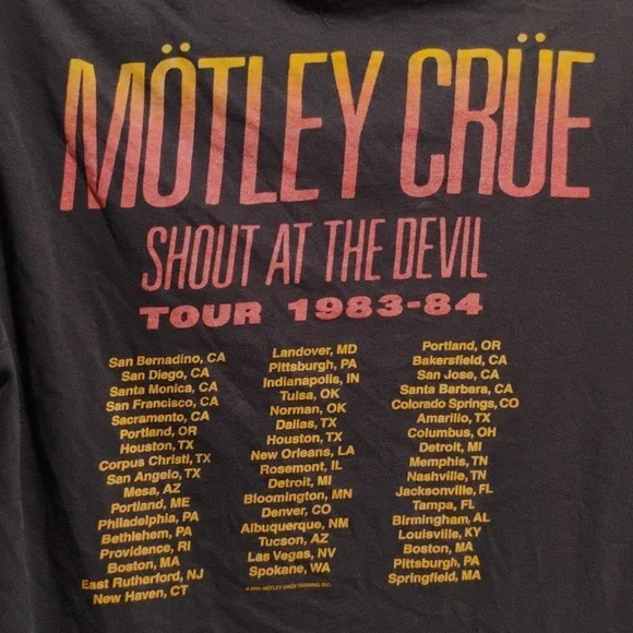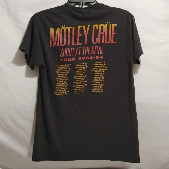 Vintage Collectible Motley Crue Shout At The Devil Tour 1983-84! 2006! No size tags!Measurements Laying Flat:Pit to pit: 19".Length: 26".Smoke and pet free home! Reasonable offers always welcome!